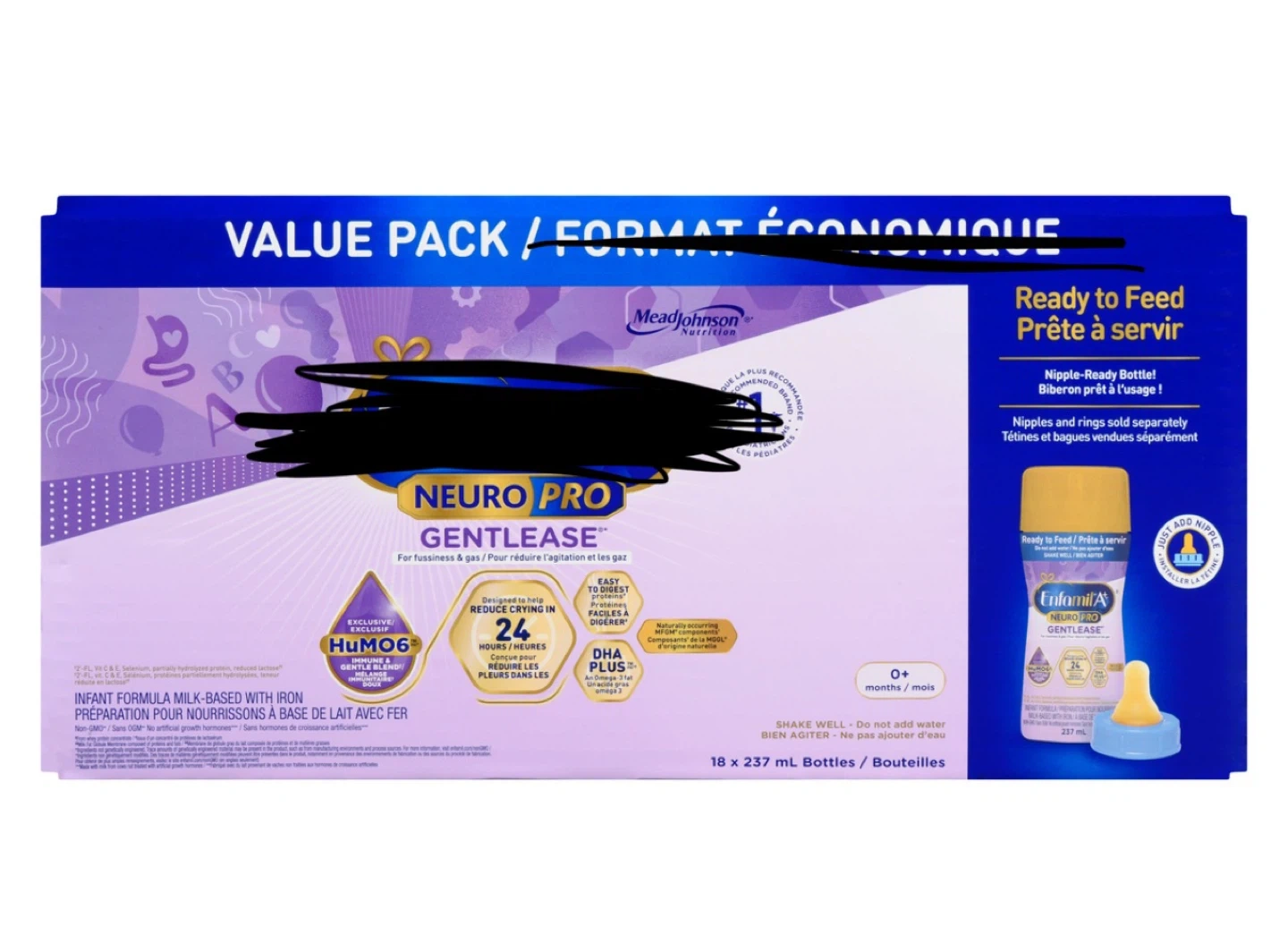 Selling a value pack of Mead Johnson Enfamil Neuro Pro Gentlease formula. It's designed to help reduce crying in 24 hours and is easy to digest. This infant formula is milk-based with iron and is non-GMO. Each bottle contains 237 mL.