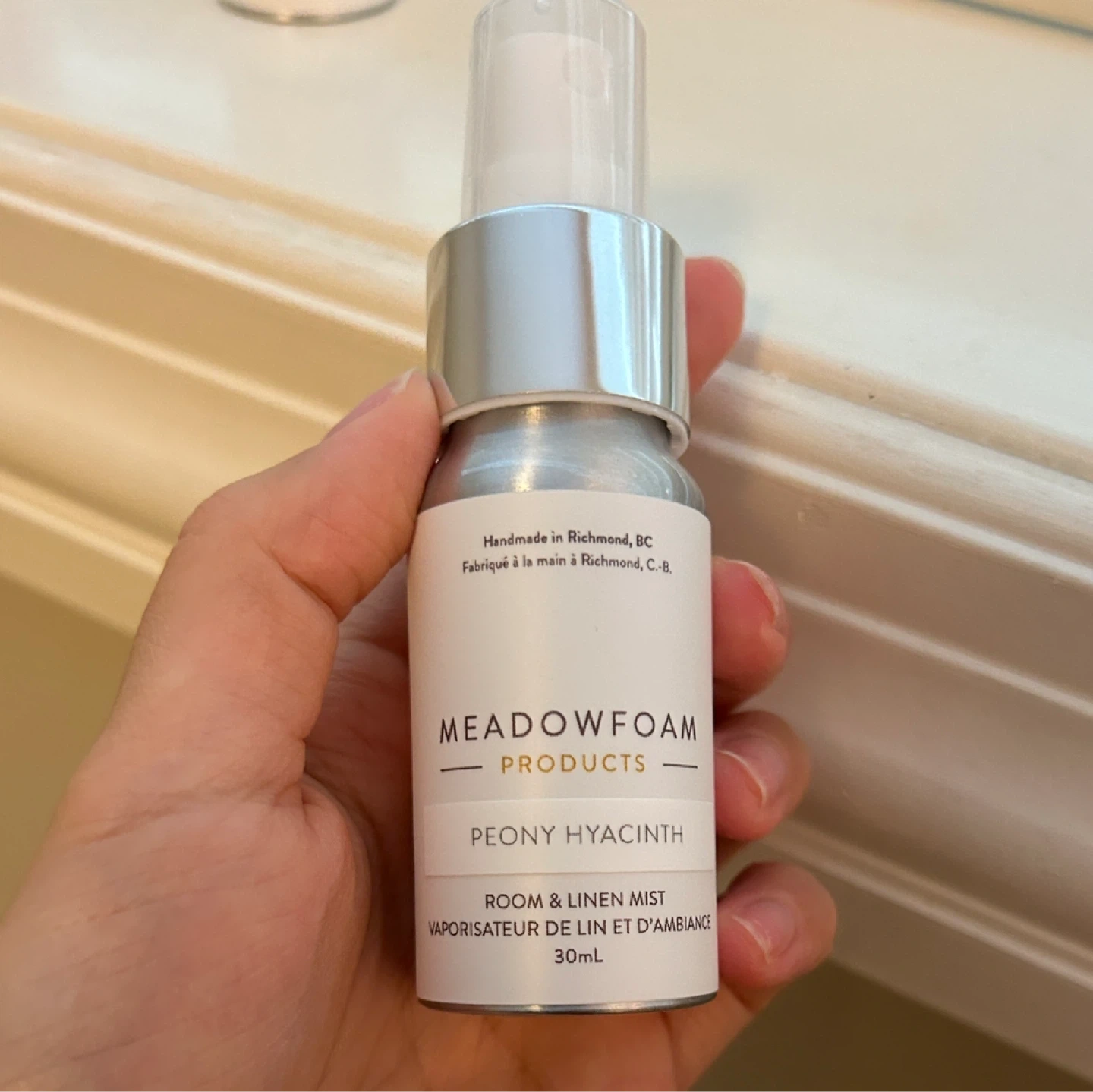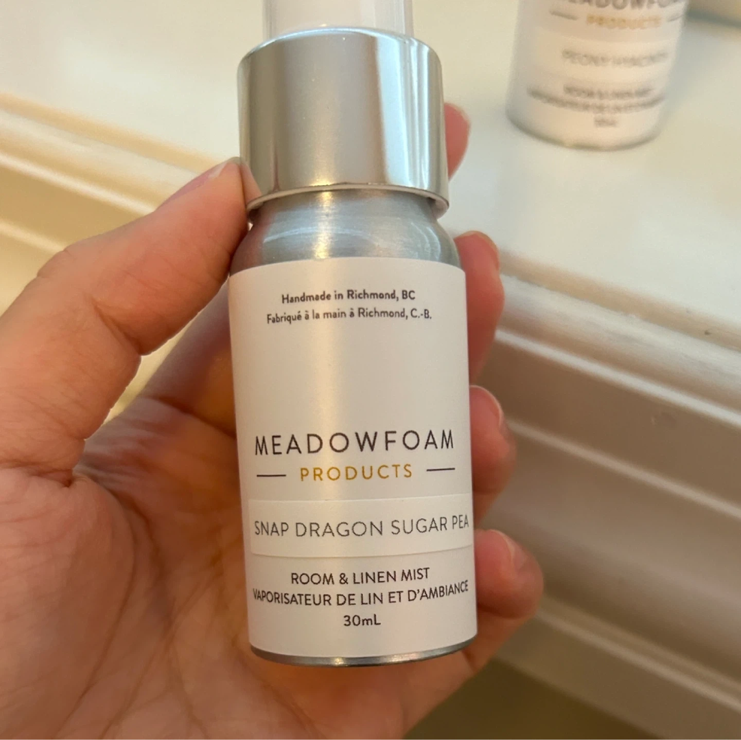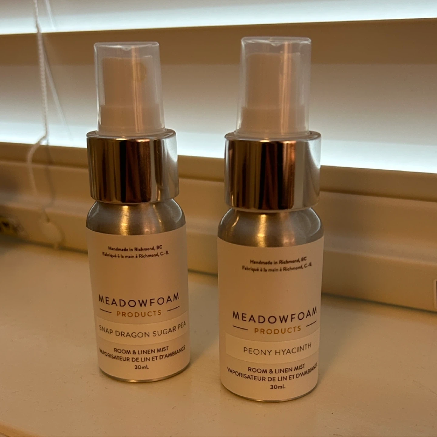 Meadowfoam Products room and linen mist in the Snap Dragon Sugar Pea scent and Peony Hyacinth. It's a 30ml bottle, handmade in Richmond, BC. Perfect for freshening up any room or linens! Meet in Burnaby
