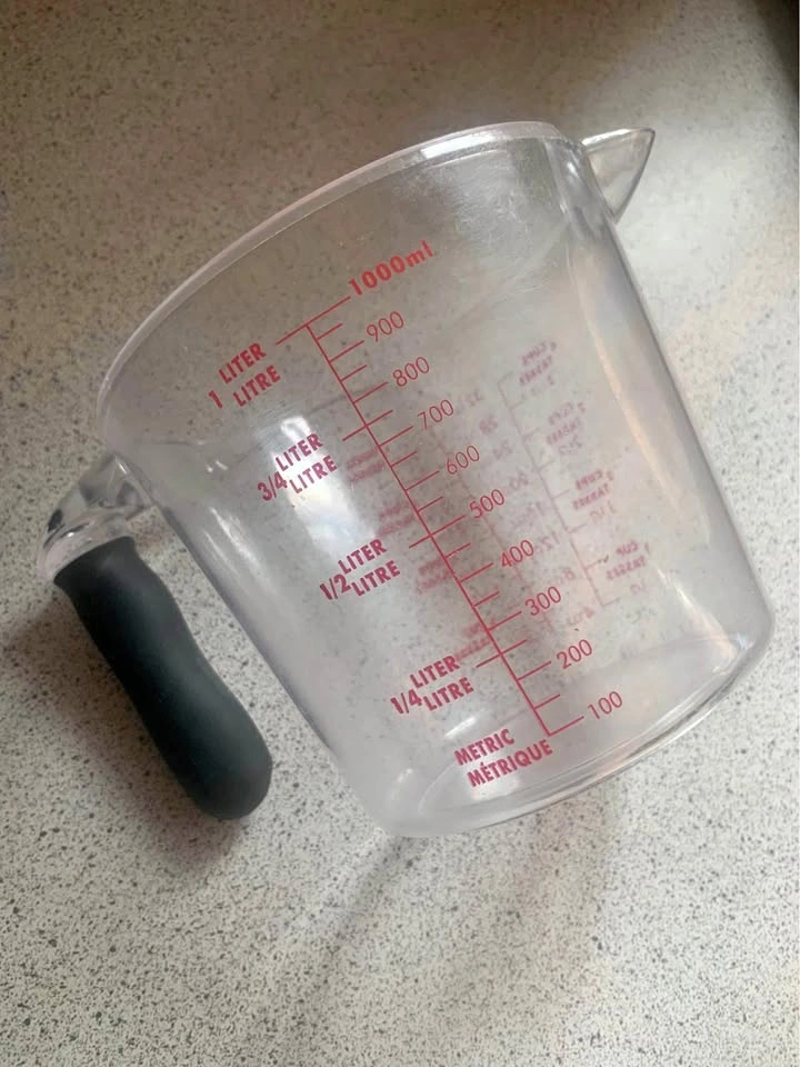 1000ml measuring cup. It has both cup and ml measurements marked in red. It's in great condition and ready for all your baking and cooking needs!
