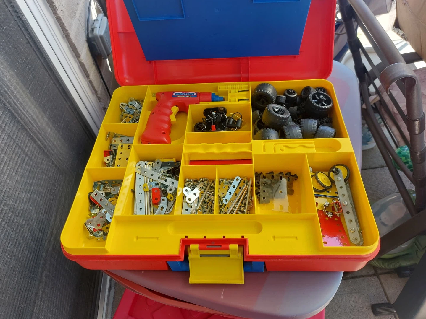 Selling a Meccano Steel Tec set. It comes with a variety of metal pieces, tools, and instructions to build different models. The set is complete and comes in a handy storage case to keep everything organized Genuine meccano set motorized
