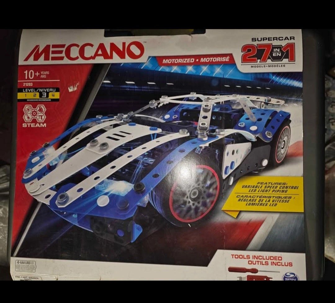 New in box Meccano Supercar building set. Includes multiple models. 27 models in total. Motorized. Ages 10+. All parts included.