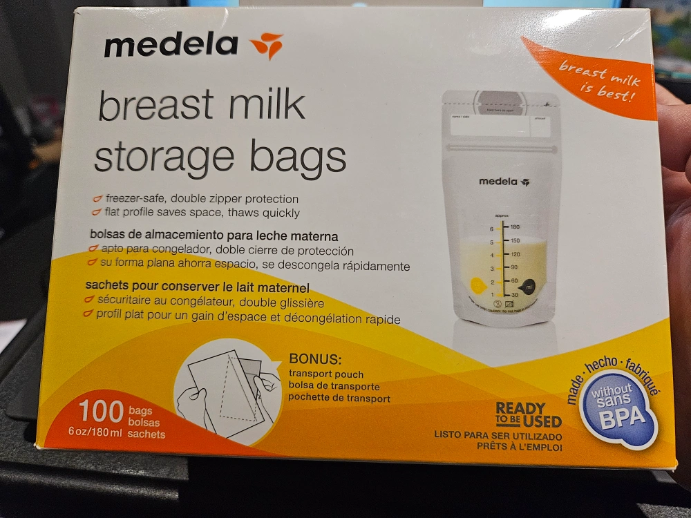 Selling a box of Medela breast milk storage bags. The box contains 100 bags, each with a 6oz/180ml capacity. They are freezer-safe with double zipper protection and a flat profile to save space and thaw quickly.
