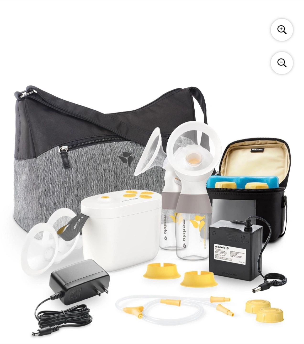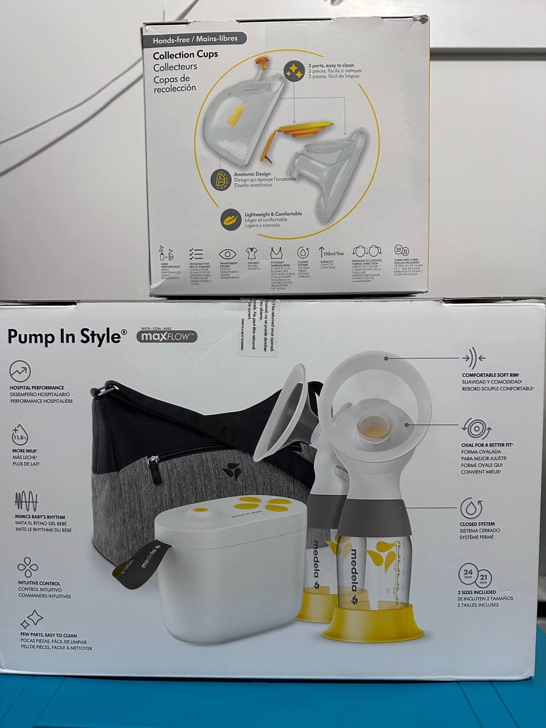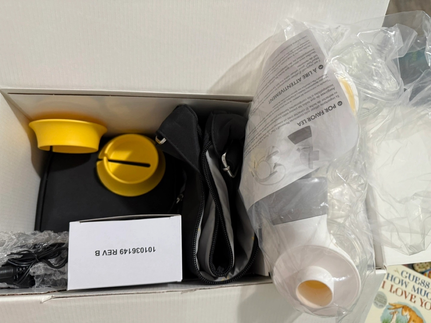Double electric breast pump. Includes carrying bag, two bottles, personal fit flanges, and rechargeable battery pack. Excellent for pumping on the go. Used several times only; switched to wireless pump; retails for $248 plus tax
