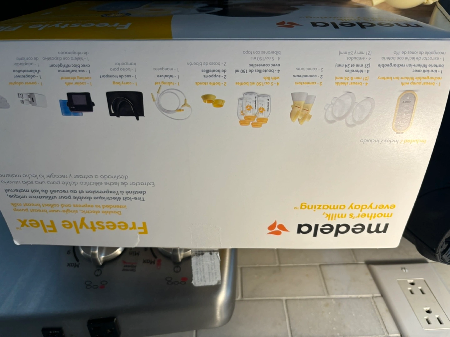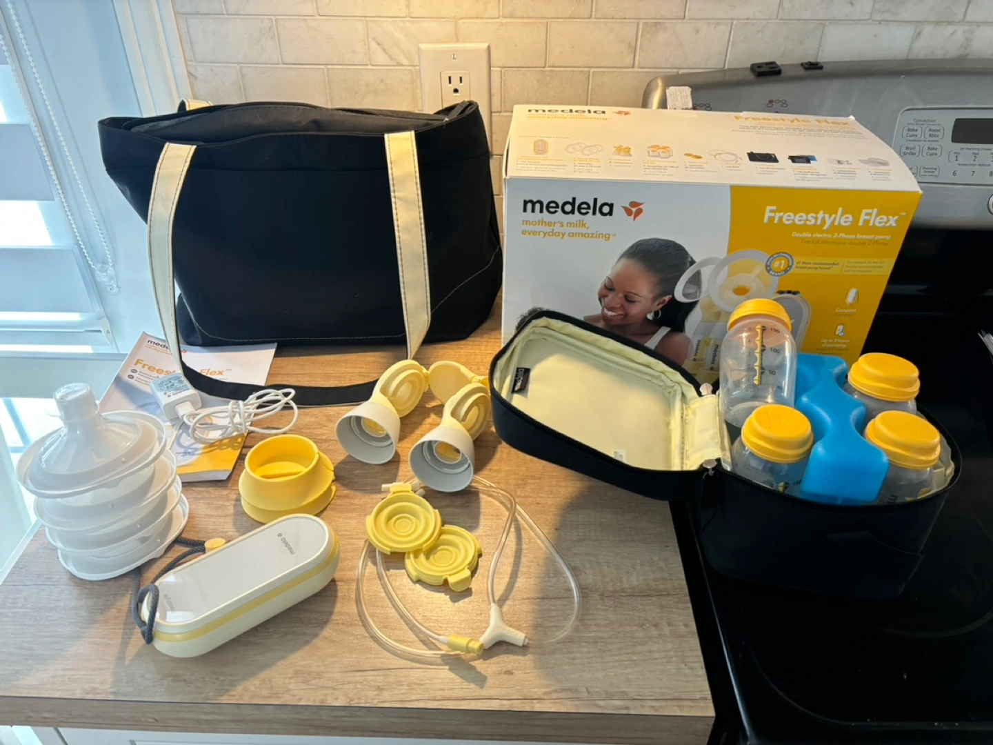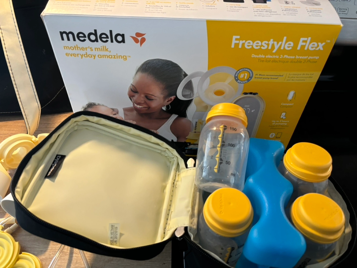 Used Medela Freestyle Flex breast pump. Includes all parts shown in photos. Double electric pump, comes with carrying bag and bottles. Good condition.