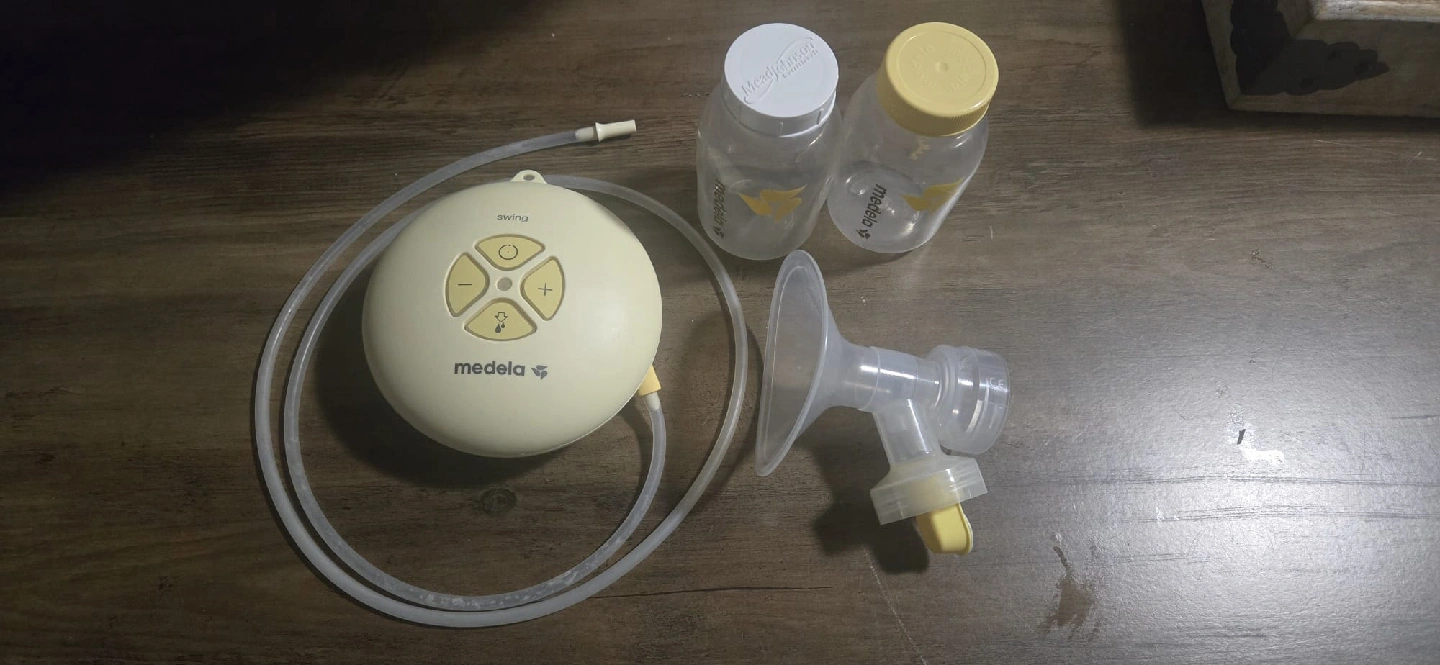 Selling a Medela Swing breast pump. It comes with the pump itself, tubing, a breast shield, and two Medela bottles. It's in good condition and ready for a new home!