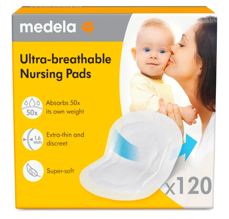 Selling an open box of Medela Ultra-breathable Nursing Pads. The box contains 100 pads. They're designed to absorb 50 times their own weight and are extra-thin for discreetness. They are also super soft!