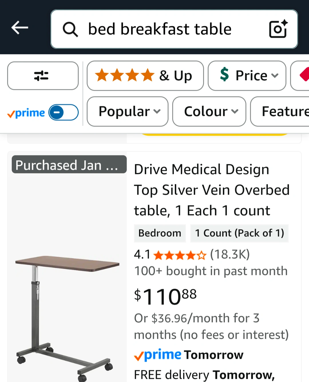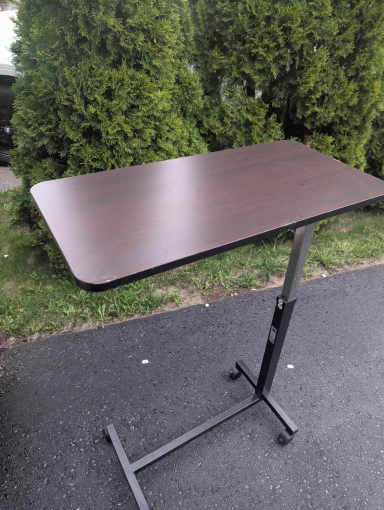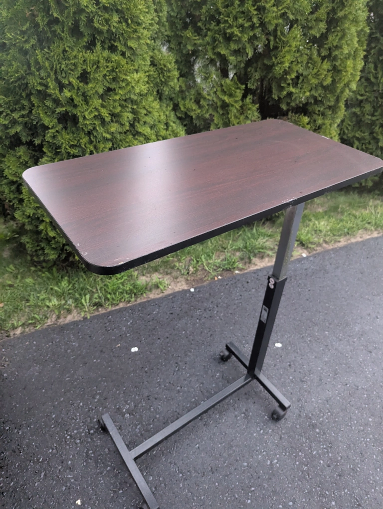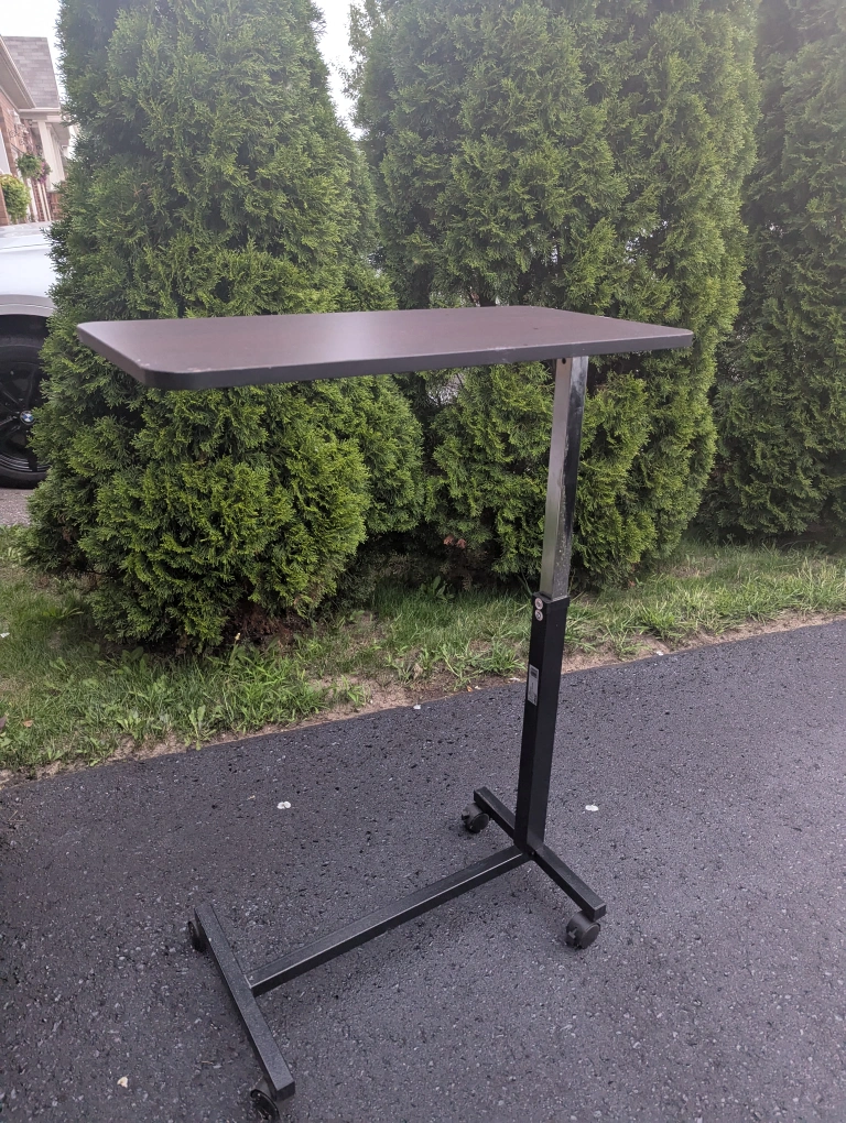 Selling a Drive Medical Design Top Silver Vein Overbed table. It's great for using while in bed or sitting in a chair. The height is adjustable, and it has wheels for easy movement. Originally bought for $110.88