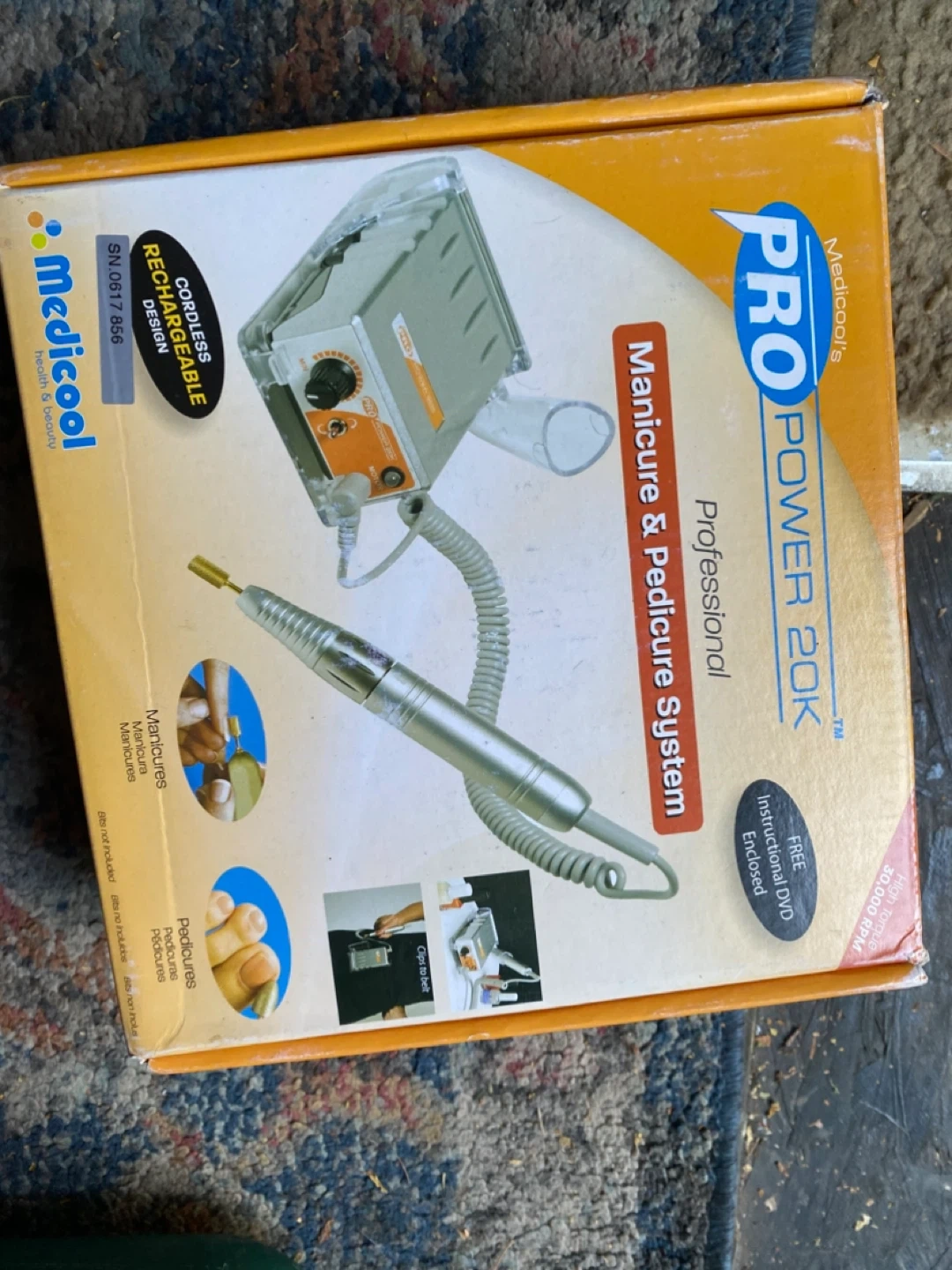 Selling a Medicool Pro Power 20K professional manicure and pedicure system. It features a cordless rechargeable design and high torque up to 30,000 RPM. A free instructional DVD is included. Perfect for at-home manicures and pedicures!