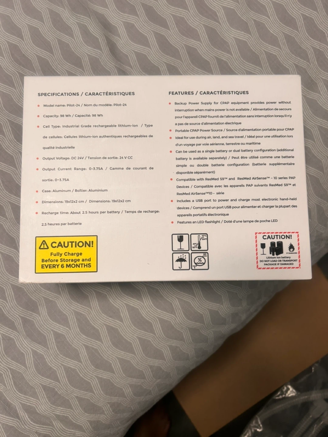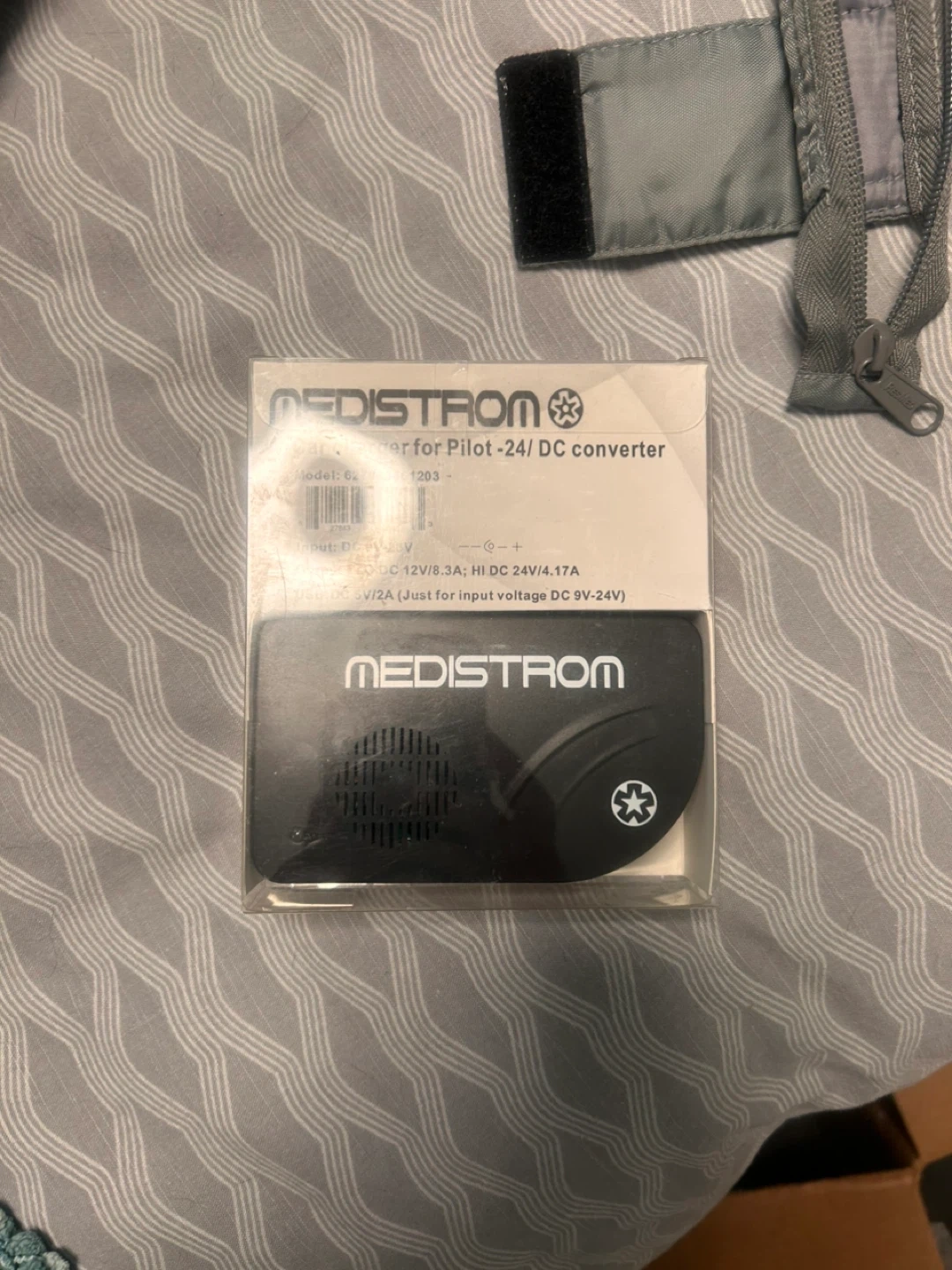 Selling a Medistrom Pilot-24 CPAP battery backup power supply. It's a 98 Wh capacity battery with a lithium-ion cell type. It can be used as a portable CPAP power source for travel. Features an LED flashlight and is compatible with ResMed AirSense 10 series PAP devices. Fully charge before storage and every 6 months! Comes with car charger as well