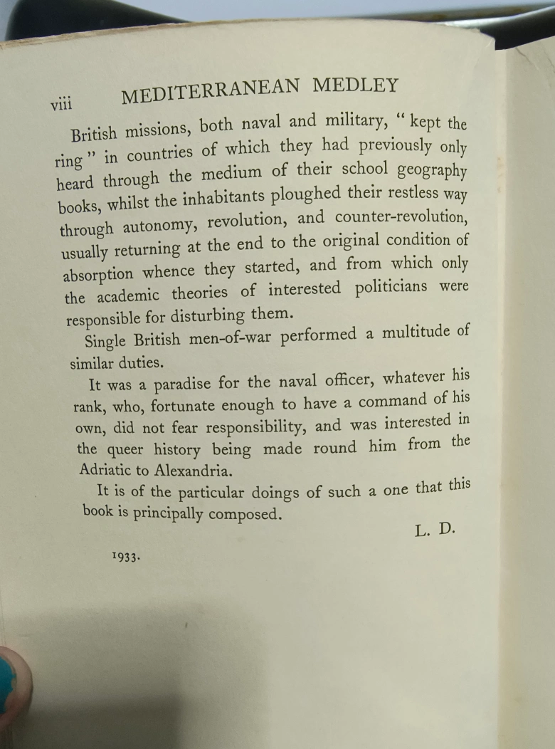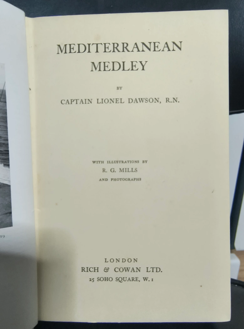 Hardcover copy of "Mediterranean Medley". Authored by: Captain Lionel Dawson, R.N. It's part of The Neptune Library series. This edition was published by Rich & Cowan, Ltd. A unique read! ** Pick Up In Kentville **