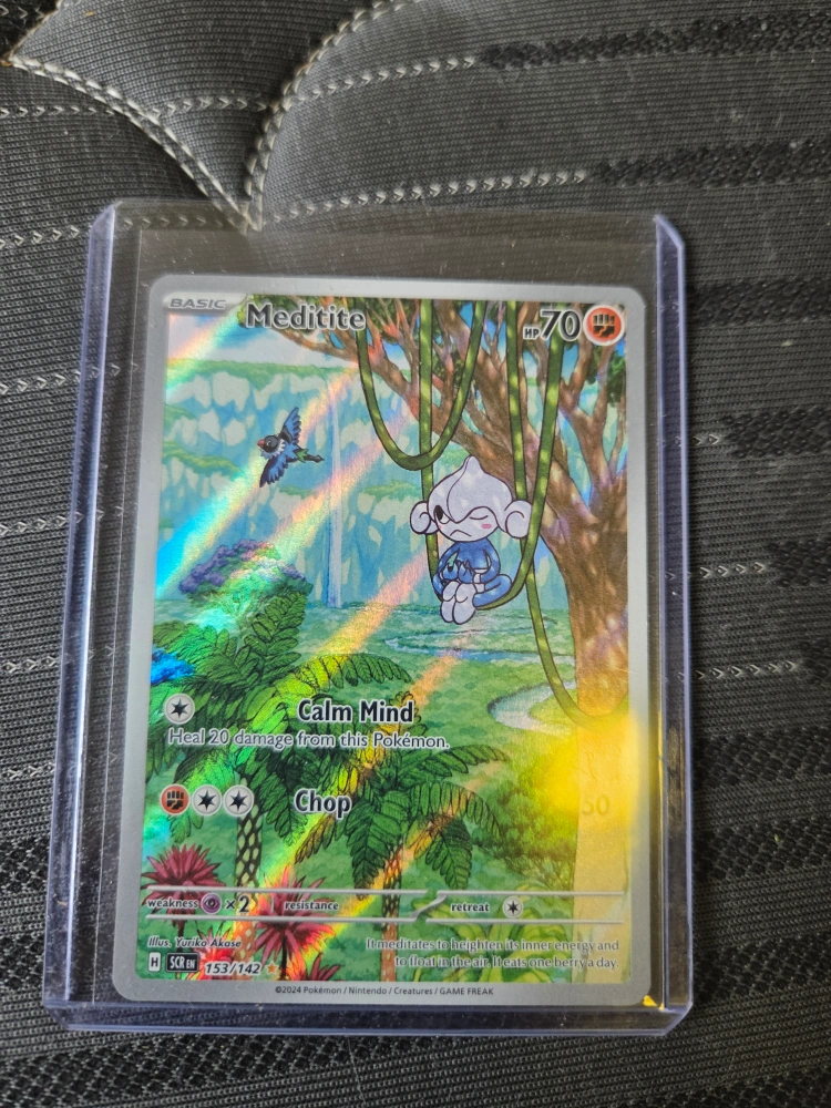 The Pokémon card 153/142 is an Illustration Rare of Meditite. This card is part of the Stellar Crown expansion of the Pokémon Trading Card Game, which was released in 2024.