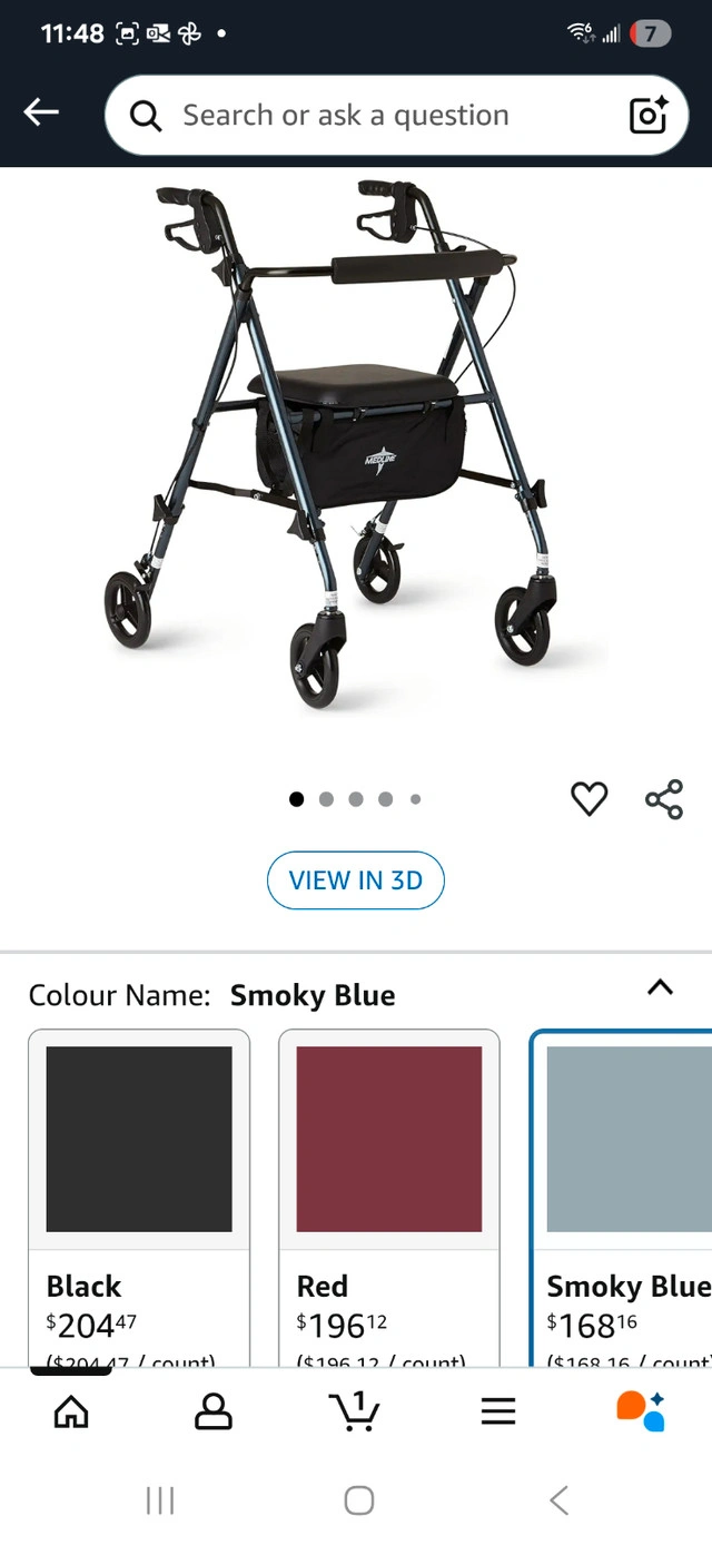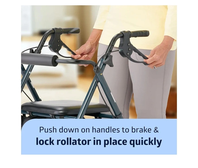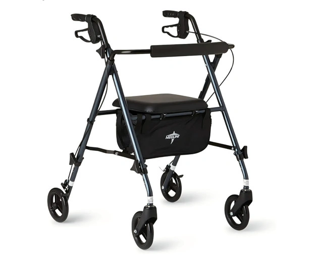 Medline Superlight Aluminum Rollator with 6" wheels in Smoky Blue. It weighs just 12.6 lbs. Features easy-to-use brake handles, height-adjustable seat and handles (12x12" padded seat adjusts 18-23" from the floor; handles adjust 29.5-36" from the floor), convenient under-seat storage, and a foldable aluminum frame. The 6" wheels are designed for smooth rolling on any terrain. It weighs 11 lbs. New condition.