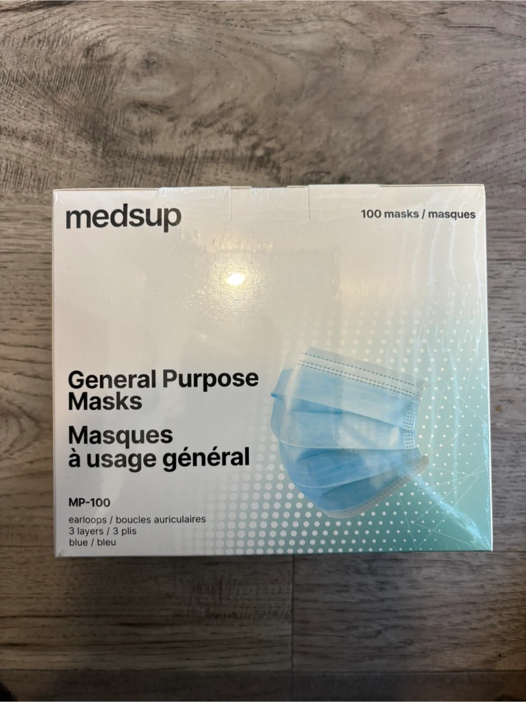 Selling a brand new, unopened box of Medsup General Purpose Masks! This box contains 100 blue, 3-ply masks. They are non-sterile and hypoallergenic.