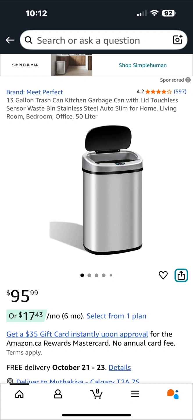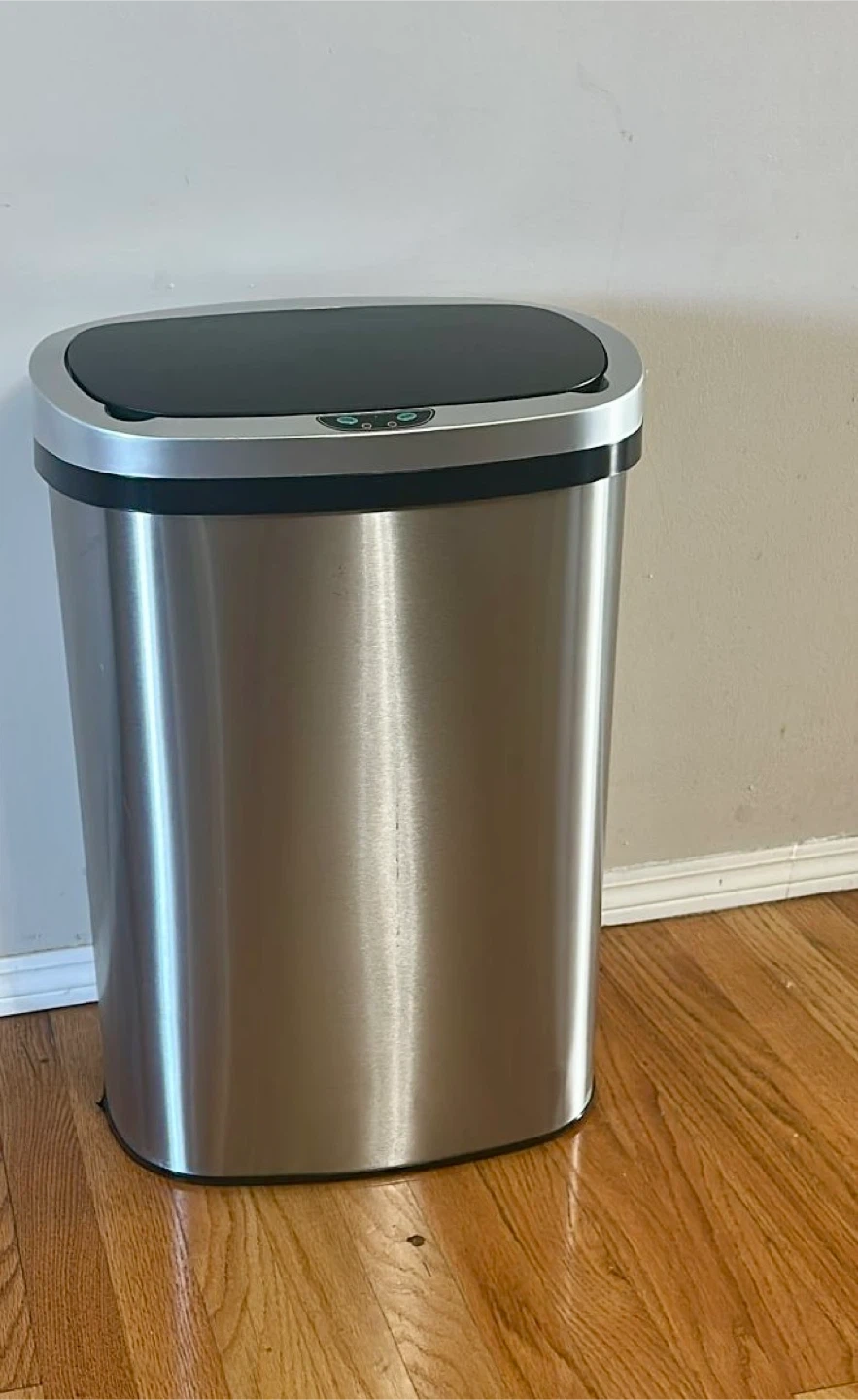 This is a Meet Perfect 13 Gallon (50 Liter) Touchless Kitchen Garbage Can. It's made of stainless steel and has a lid with a touchless sensor. It's an auto slim design, perfect for home, living room, bedroom, or office. Originally bought for $95.99