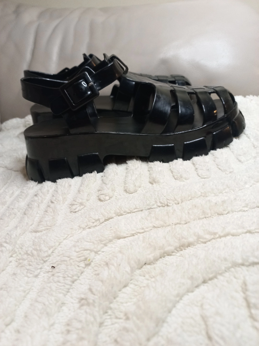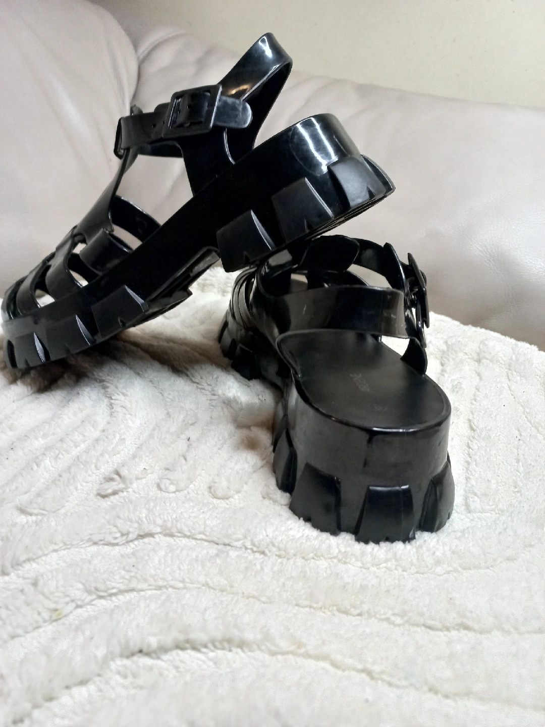 These are a pair of black jelly sandals from Melissa! They are in great condition and are a size 7.5. Perfect for summer, these sandals are waterproof and easy to clean. They have a unique caged design and a comfortable platform sole. They're super stylish and ready for a new home!