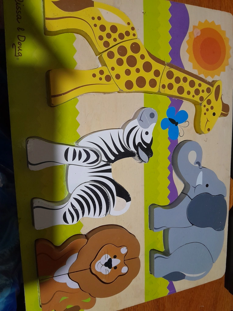 A fun wooden puzzle from Melissa & Doug featuring a giraffe, zebra, elephant, and lion! It's a great way to help your little one develop their problem-solving skills and learn about different animals