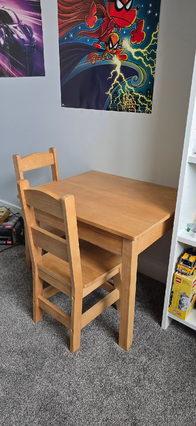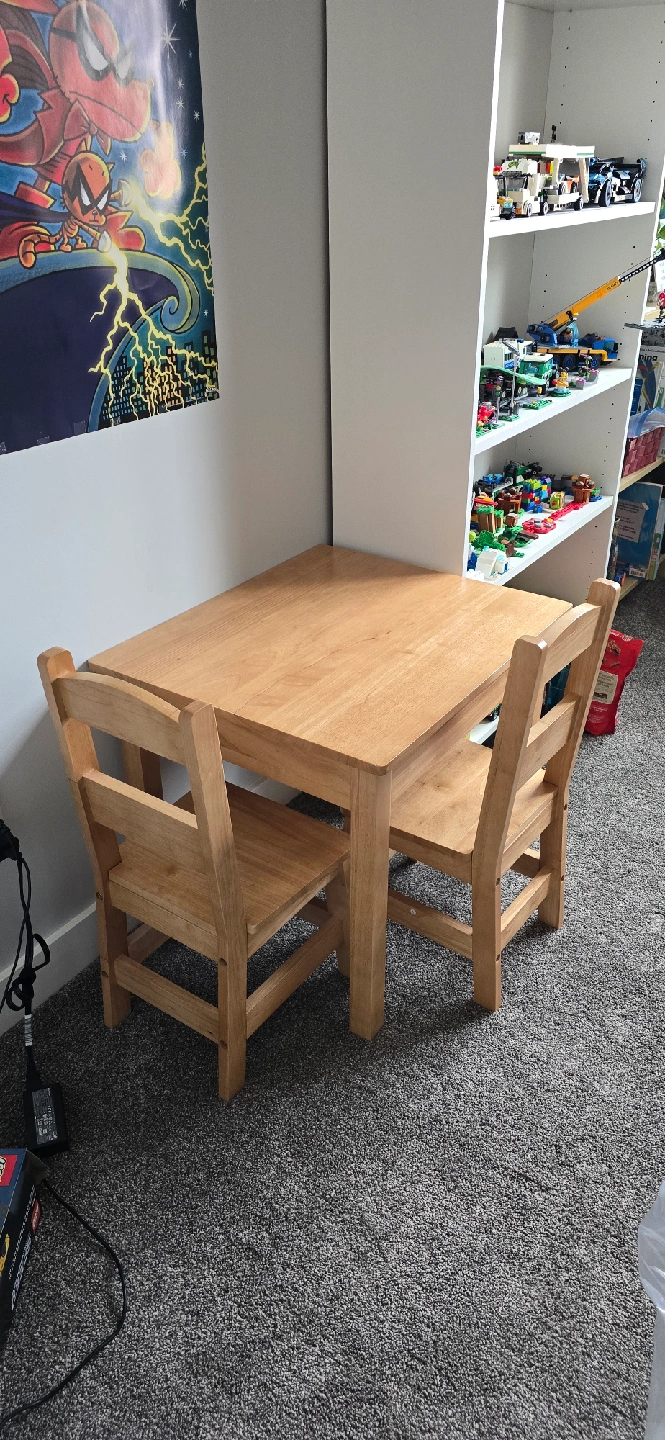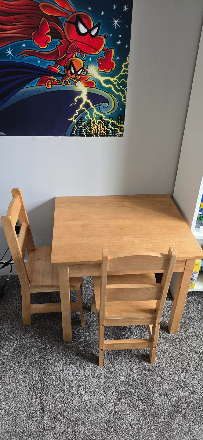 Selling a cute wooden table and chairs set, perfect for kids! This sturdy set is great for playtime, crafts, or snack time. It's in good condition and ready for a new home. It's a great addition to any playroom or child's bedroom!