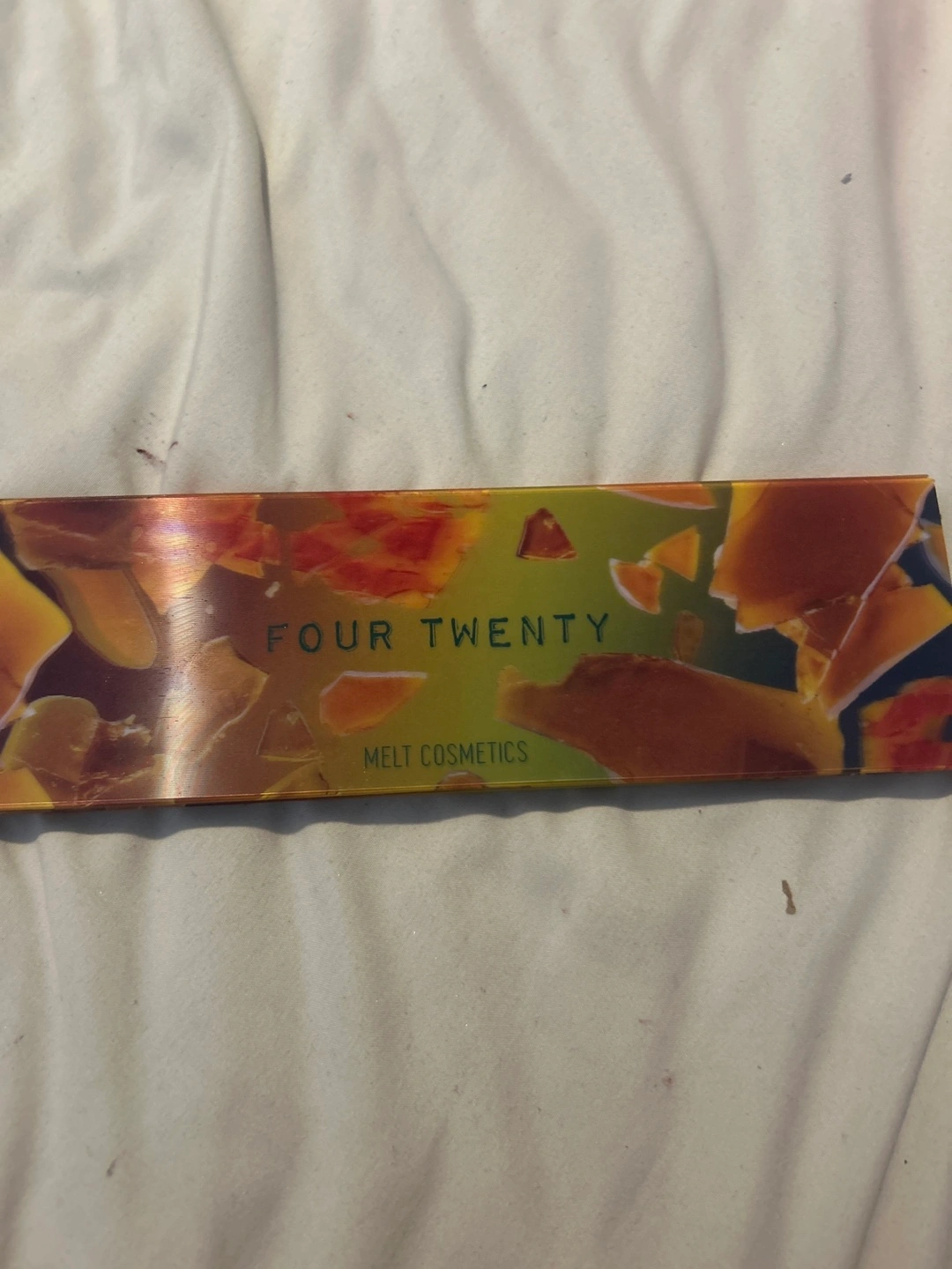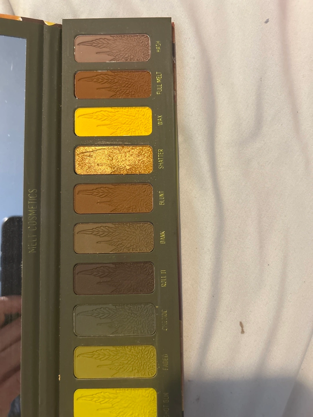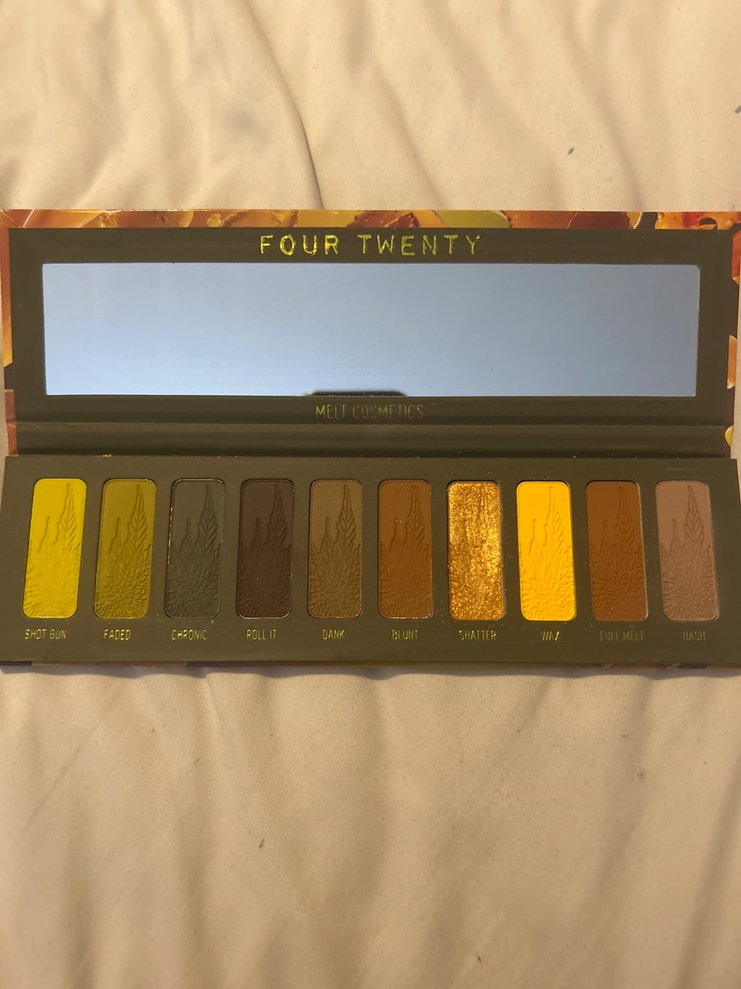 New, unused eyeshadow palette. Eight shades of earthy greens, browns, and golds. Cannabis leaf design. Comes in original packaging.
