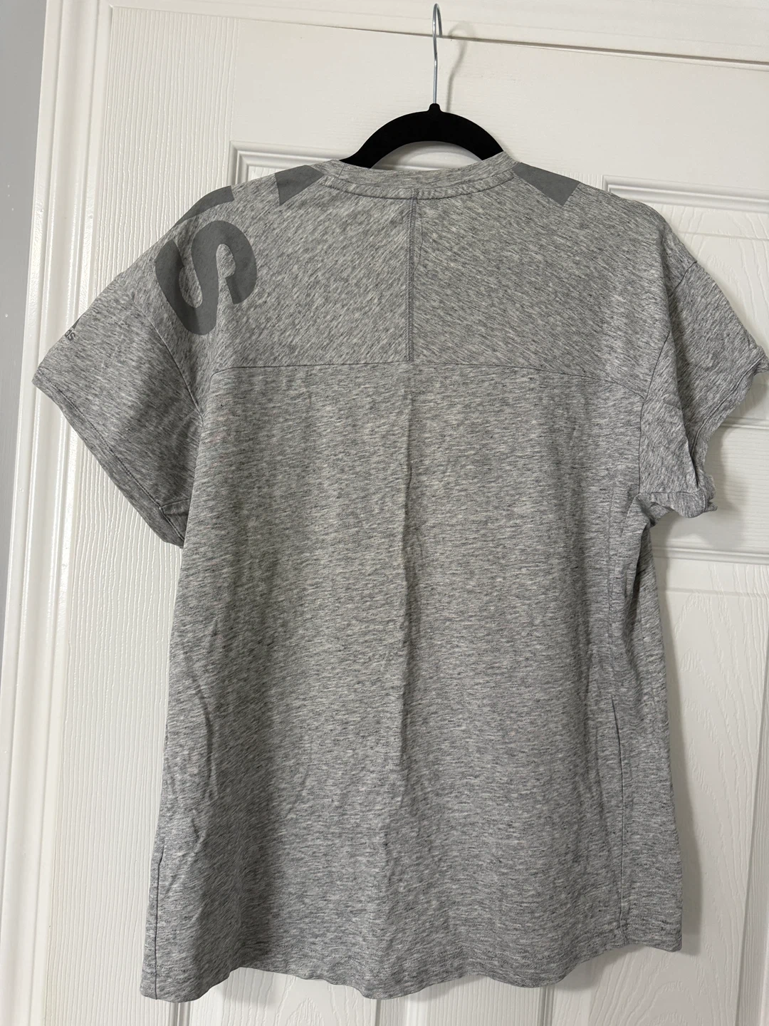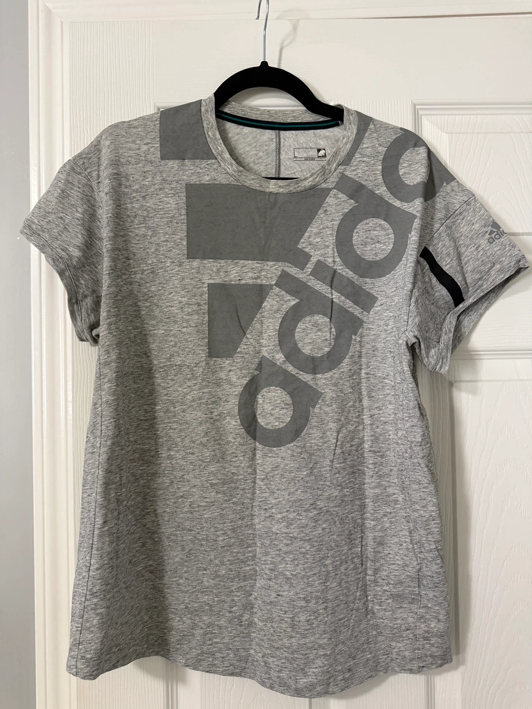 Selling a grey Adidas t-shirt. It's in great condition and has a unique design with the Adidas logo on the front. Perfect for workouts or casual wear!