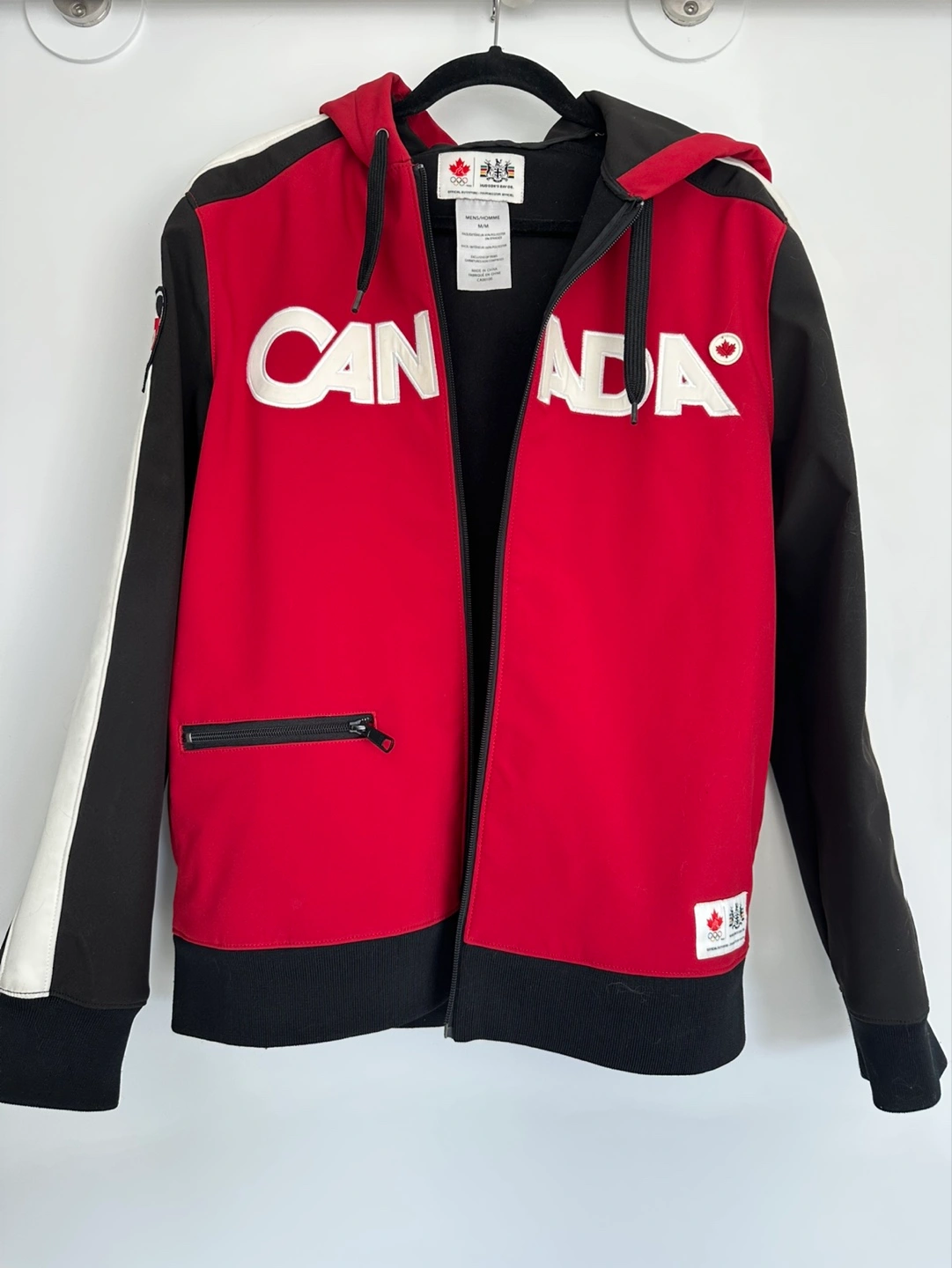 Vintage men's medium red and black zip-up hoodie made by Hudson’s Bay for the 2010 Olympics. Features the word "CANADA" across the chest and Olympic patches on the sleeves. Made in China. 95% polyester, 5% spandex.