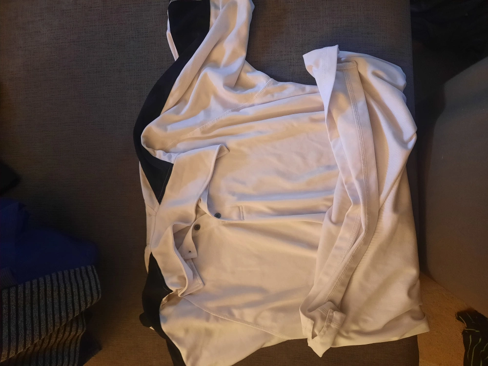 We have here polyester athletic shirt a white and black with buttons and a collar. It's in good condition and perfect for workouts or casual wear. The material is lightweight and comfortable. 2XL mens