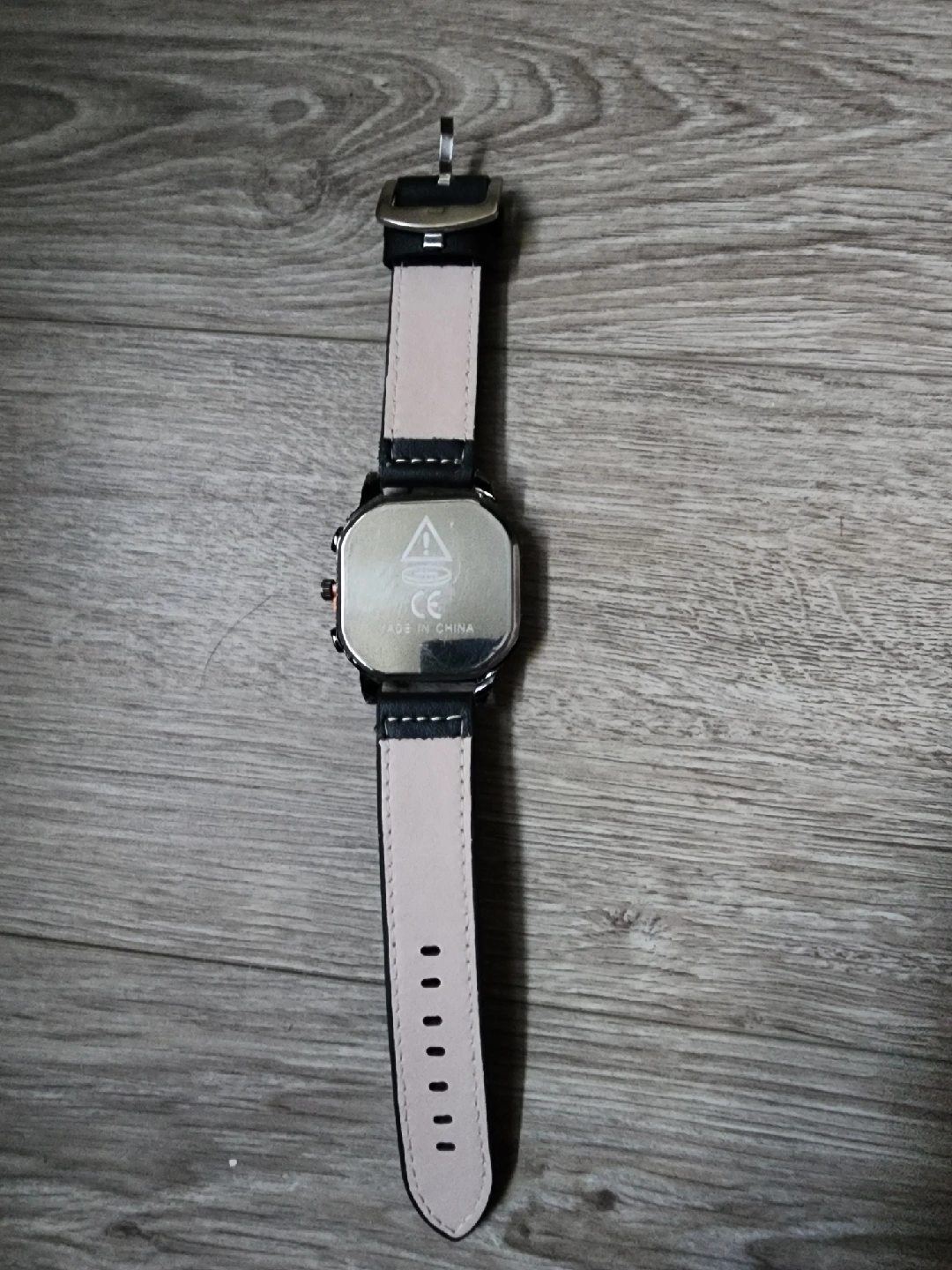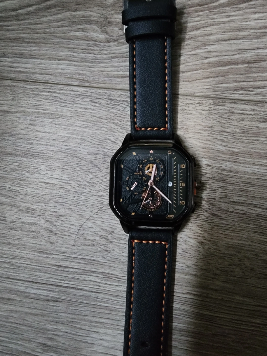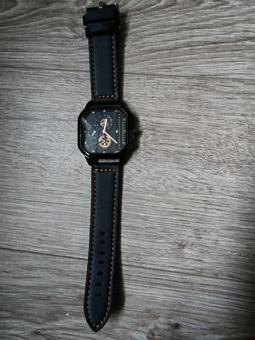 Selling a stylish men's watch with a black leather strap. It's in great condition and ready to wear. The watch features a unique square face and detailed dial. Perfect for adding a touch of sophistication to any outfit!