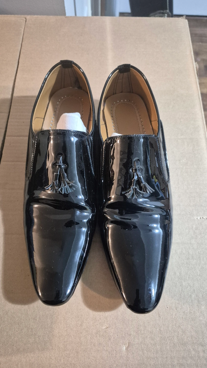 Pair of men's black patent leather loafers. Slip-on style. Small tassel detail. Size 8.