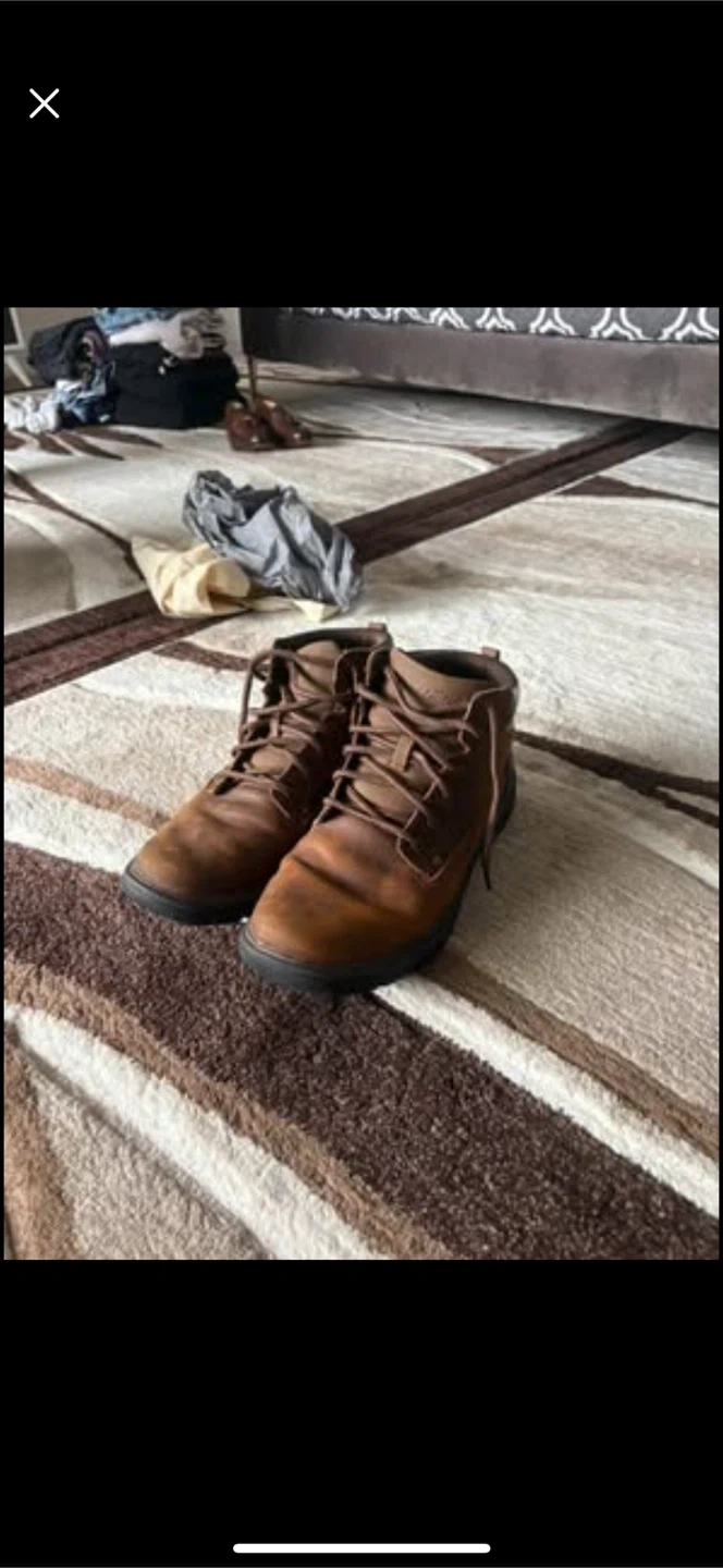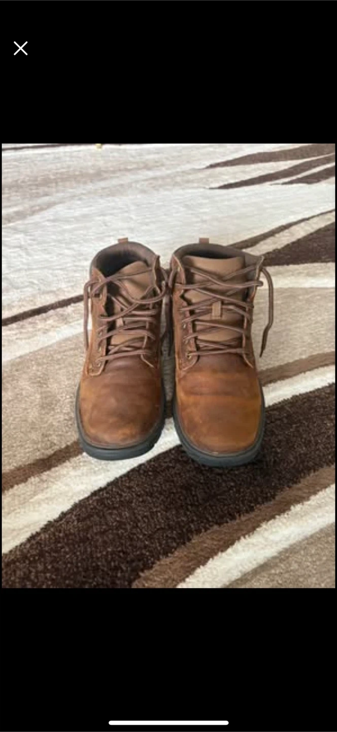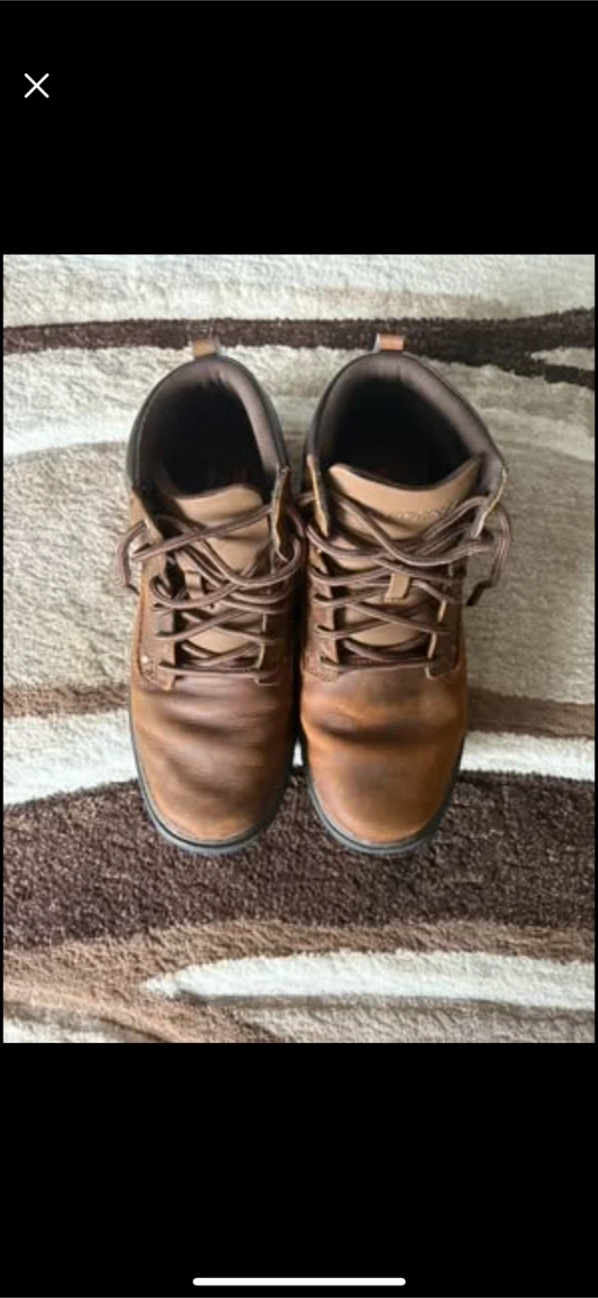 Selling a pair of men's work boots in brown leather. They show some signs of wear, as you can see in the photos, but they're still in good condition for work or everyday use. These boots are sturdy and ready for a new home!