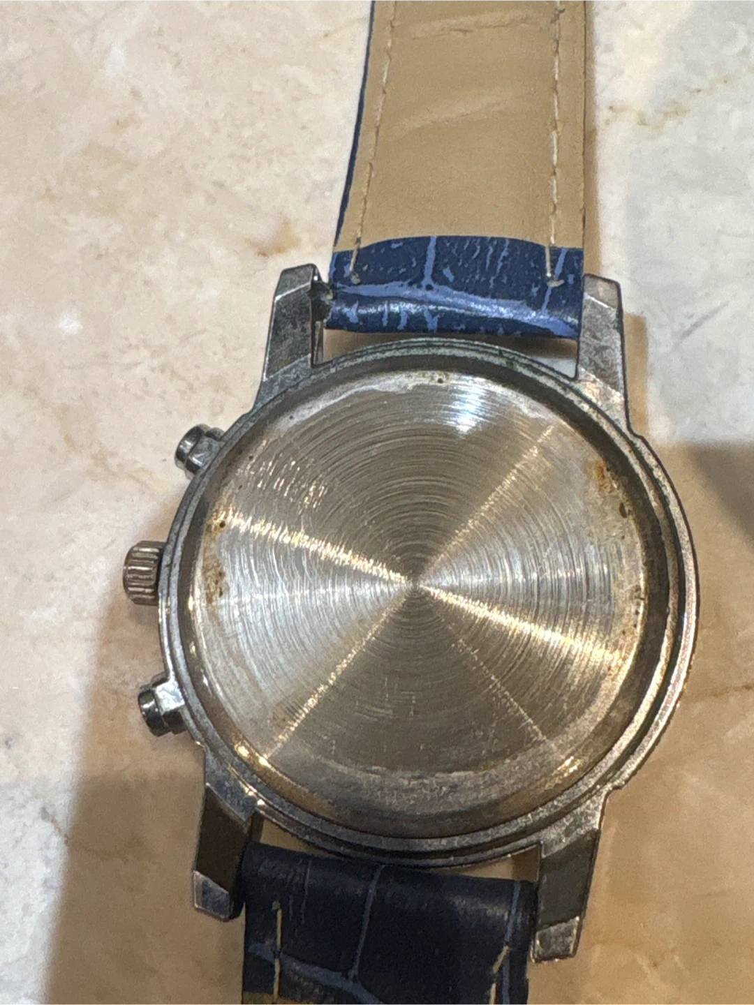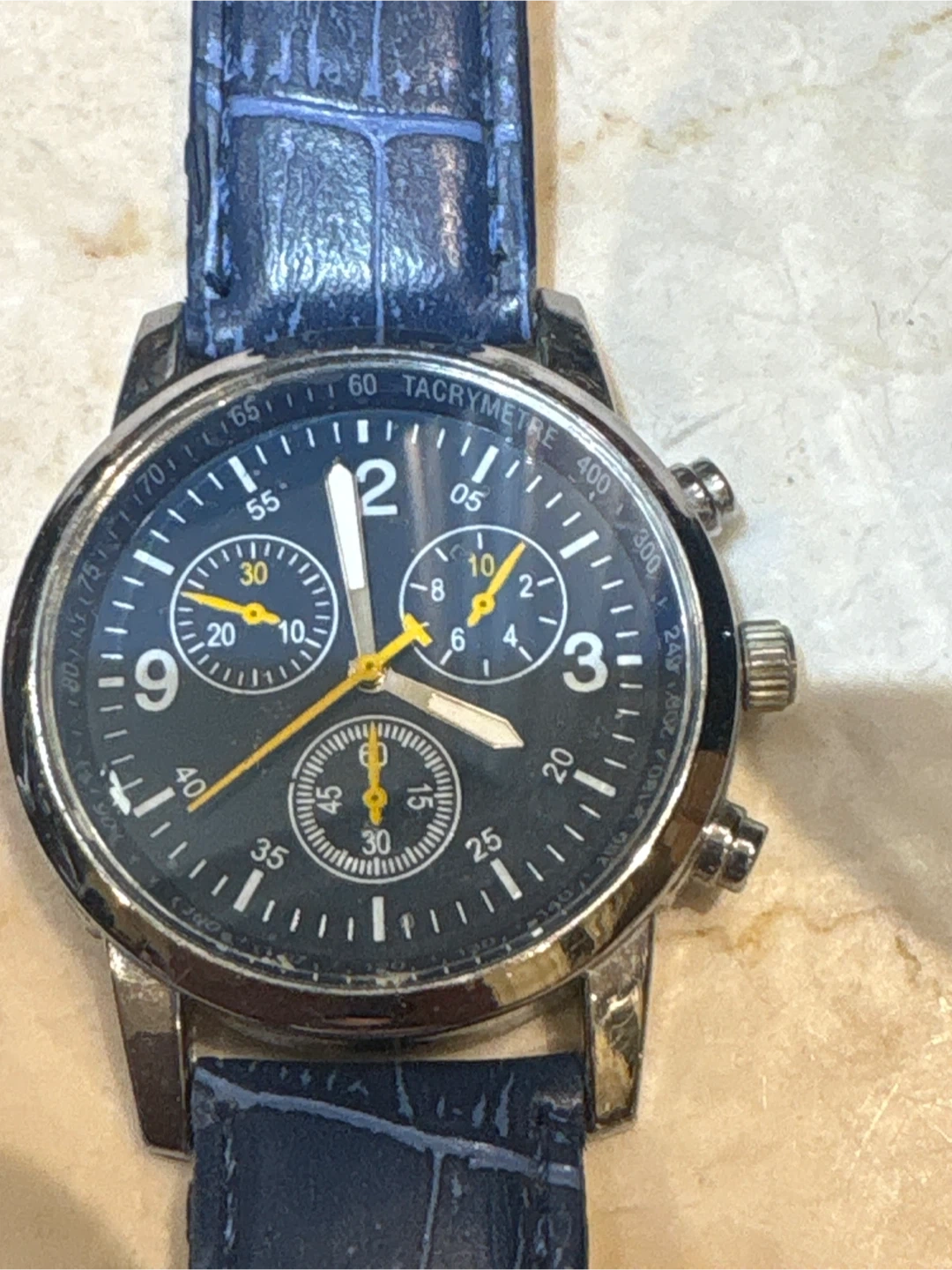 Selling a men's chronograph watch with a blue leather band. The watch face is black with yellow accents. Shows some signs of wear, but still looks great! Parkside Drive south of Bloor and keele station area
