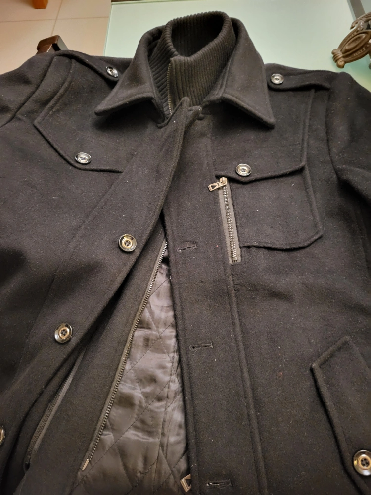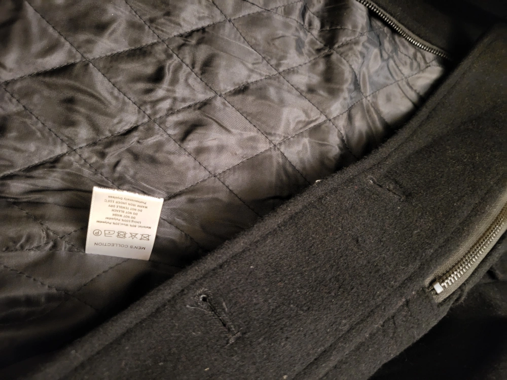 A stylish black jacket from Men's Collection! It's a wool blend, perfect for staying warm. The lining is quilted for extra comfort. A great addition to any wardrobe!
