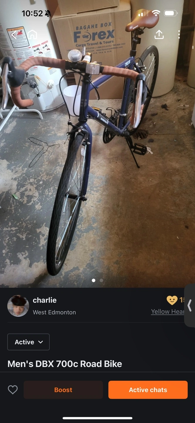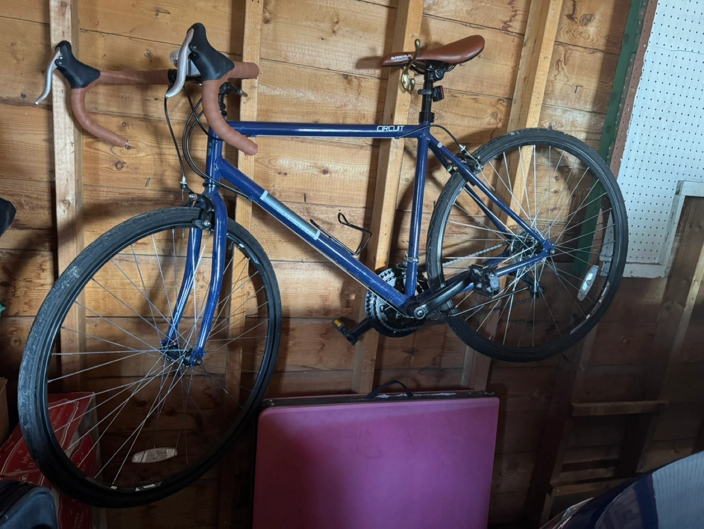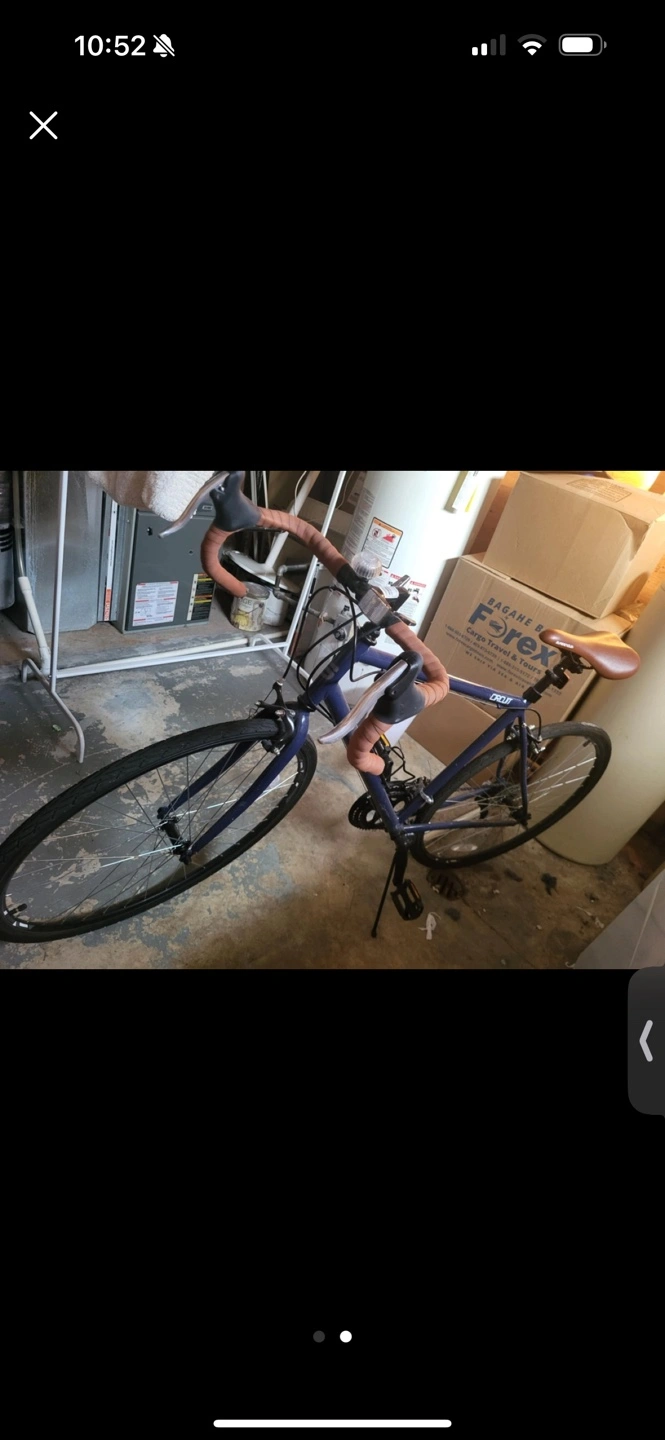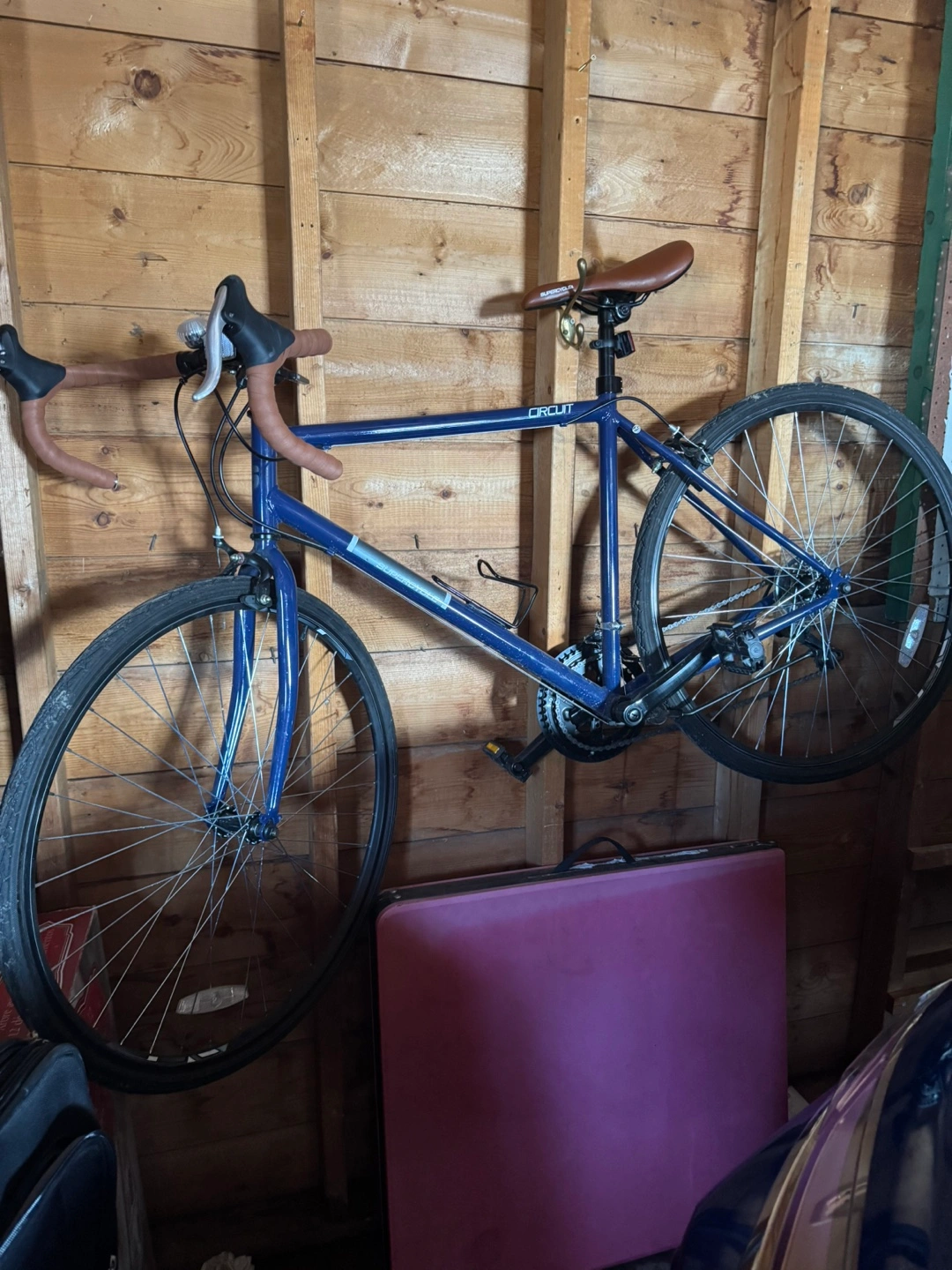 Used men's road bike. Blue frame. Brown leather handlebar tape and saddle. 700c wheels. Good condition.