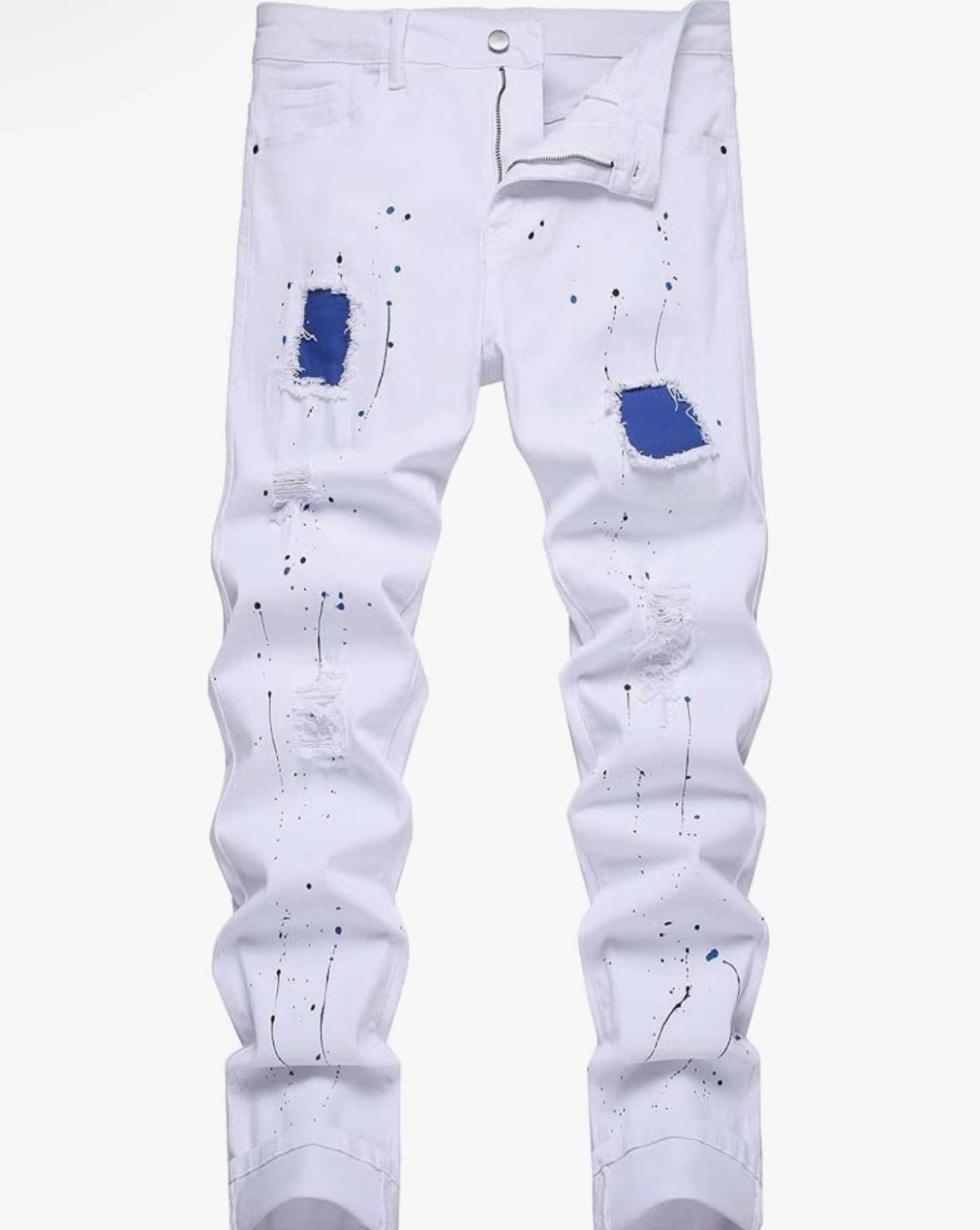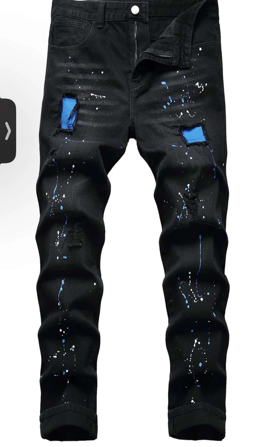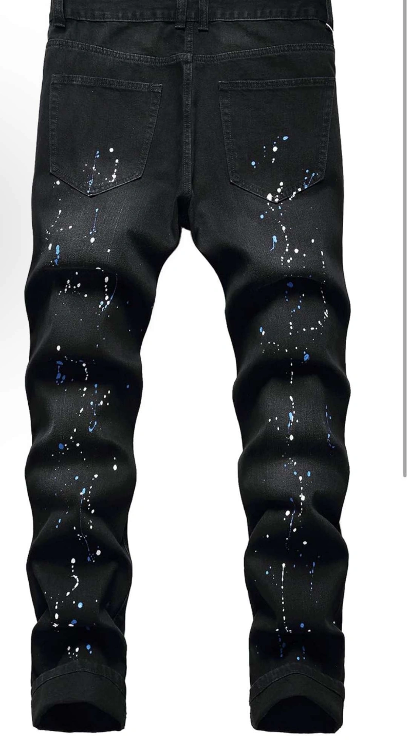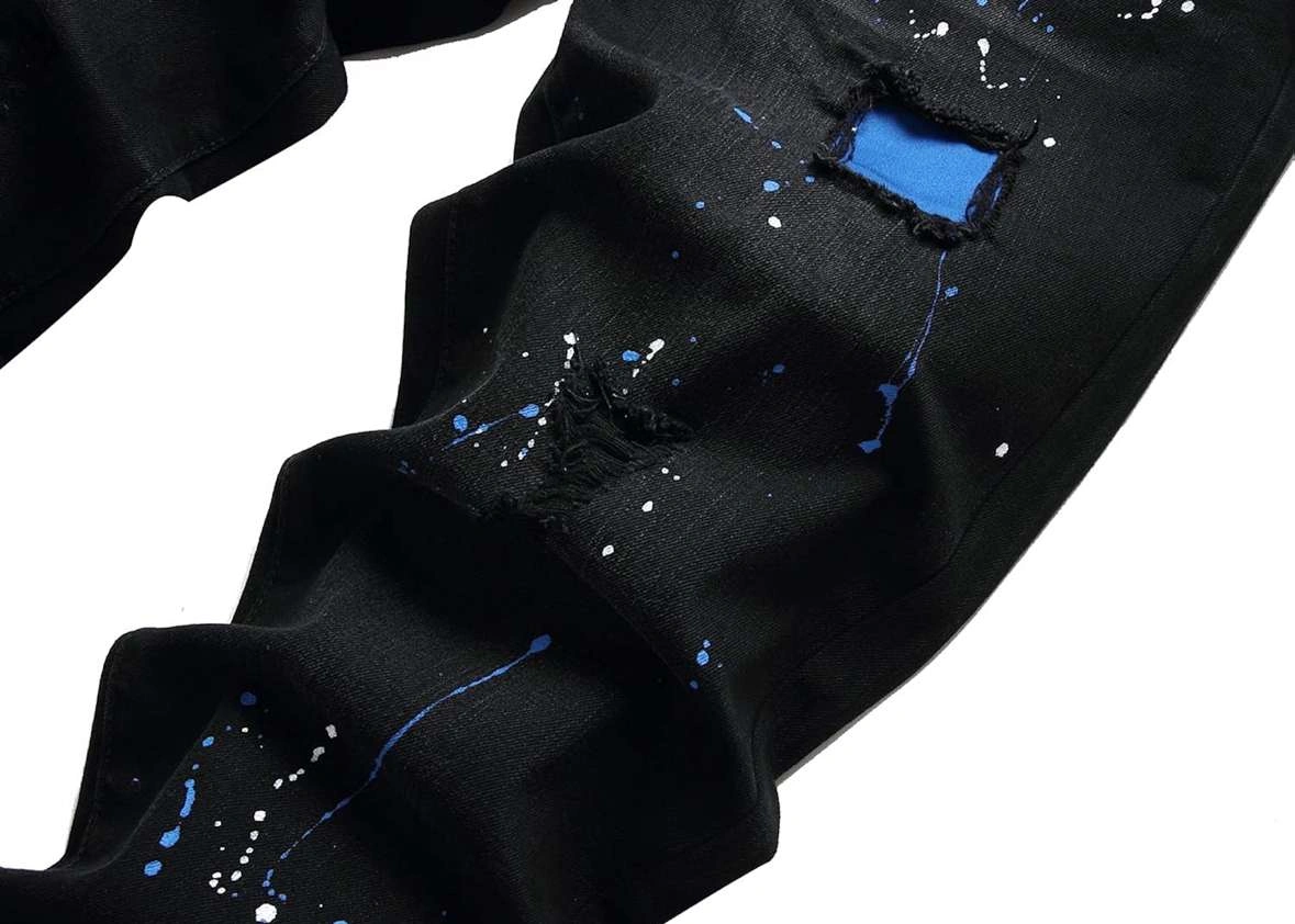 Black denim jeans. Ripped and distressed detailing. Blue and white paint splatters. Straight leg.