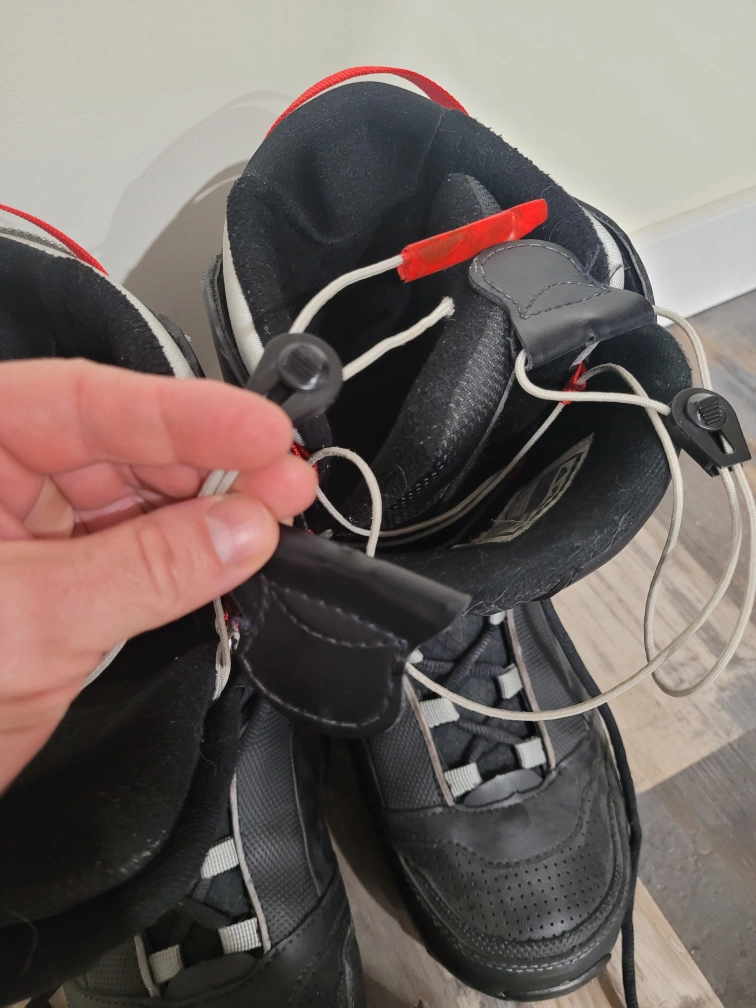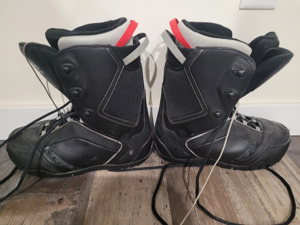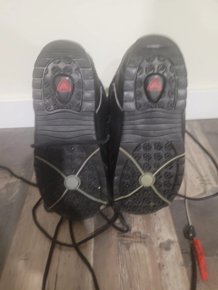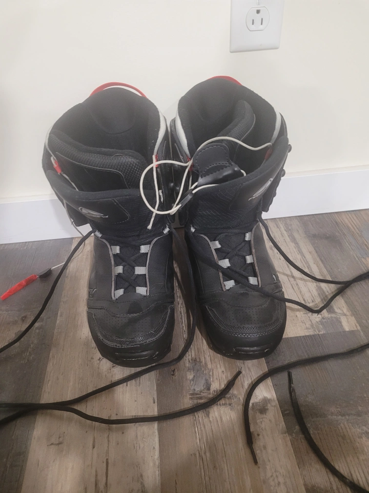 Pre-owned men's snowboard boots. Boots in good condition. Inside pullstring on one boot snapped apart on the end, but it still works and can still be tightened (see last pic).
