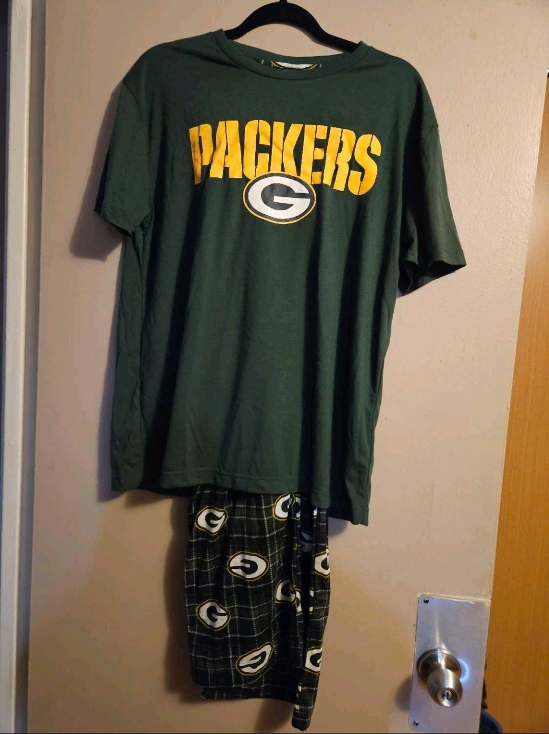 men's Green Bay Packers pajama set sz L with a green t-shirt and plaid shorts featuring the Packers logo Pick up in Whitby.. jeffery/dundas.. evening pick up .. no porch pick up