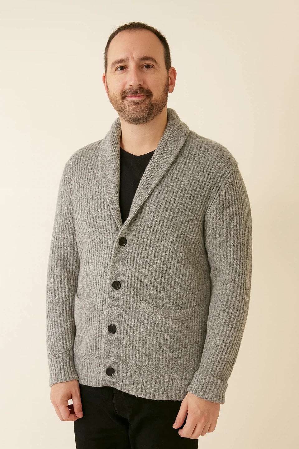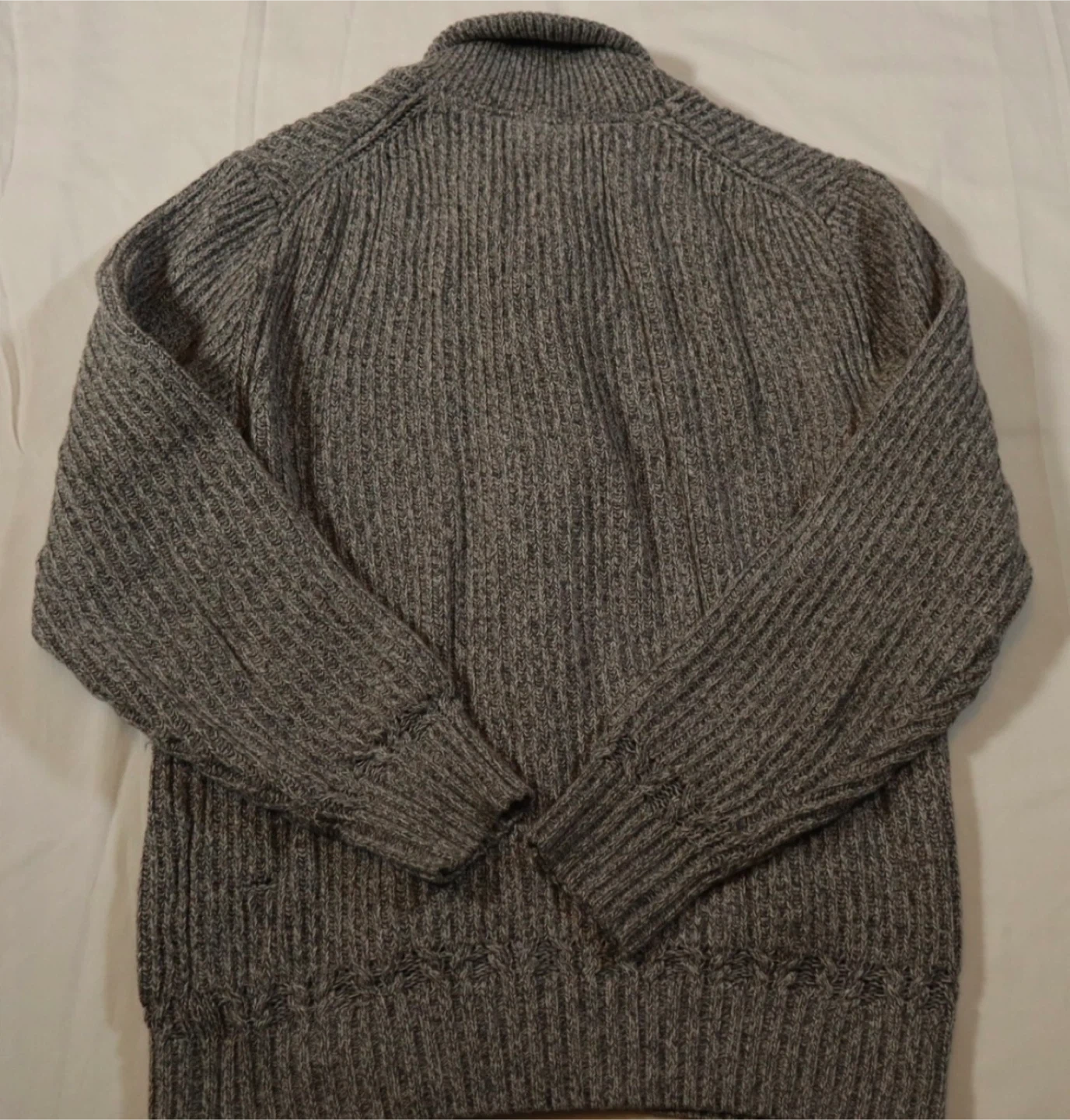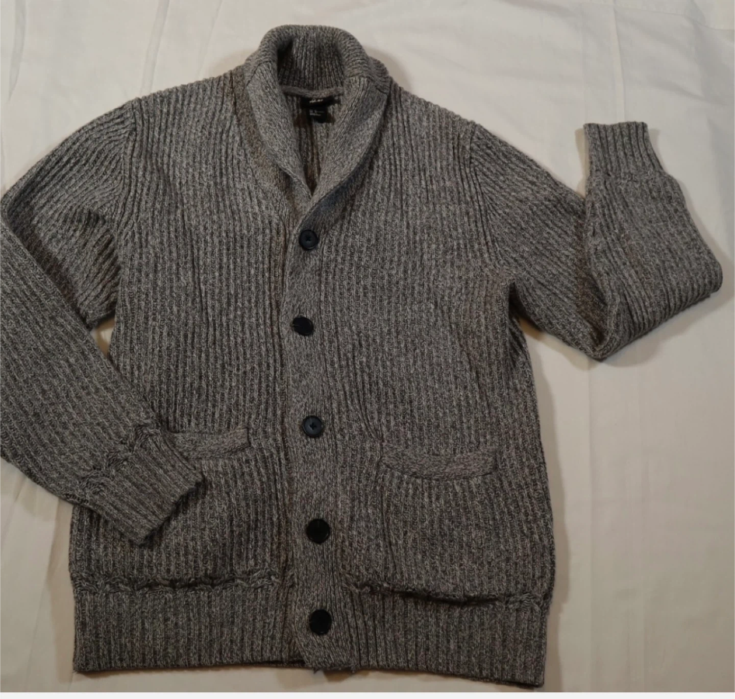 Selling a gently used men's grey cardigan sweater. It features a shawl collar and button-up closure. Perfect for layering during the cooler months!