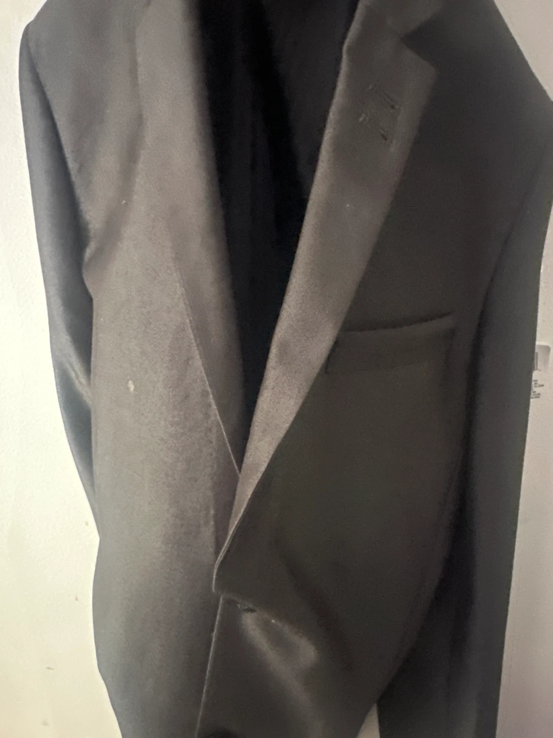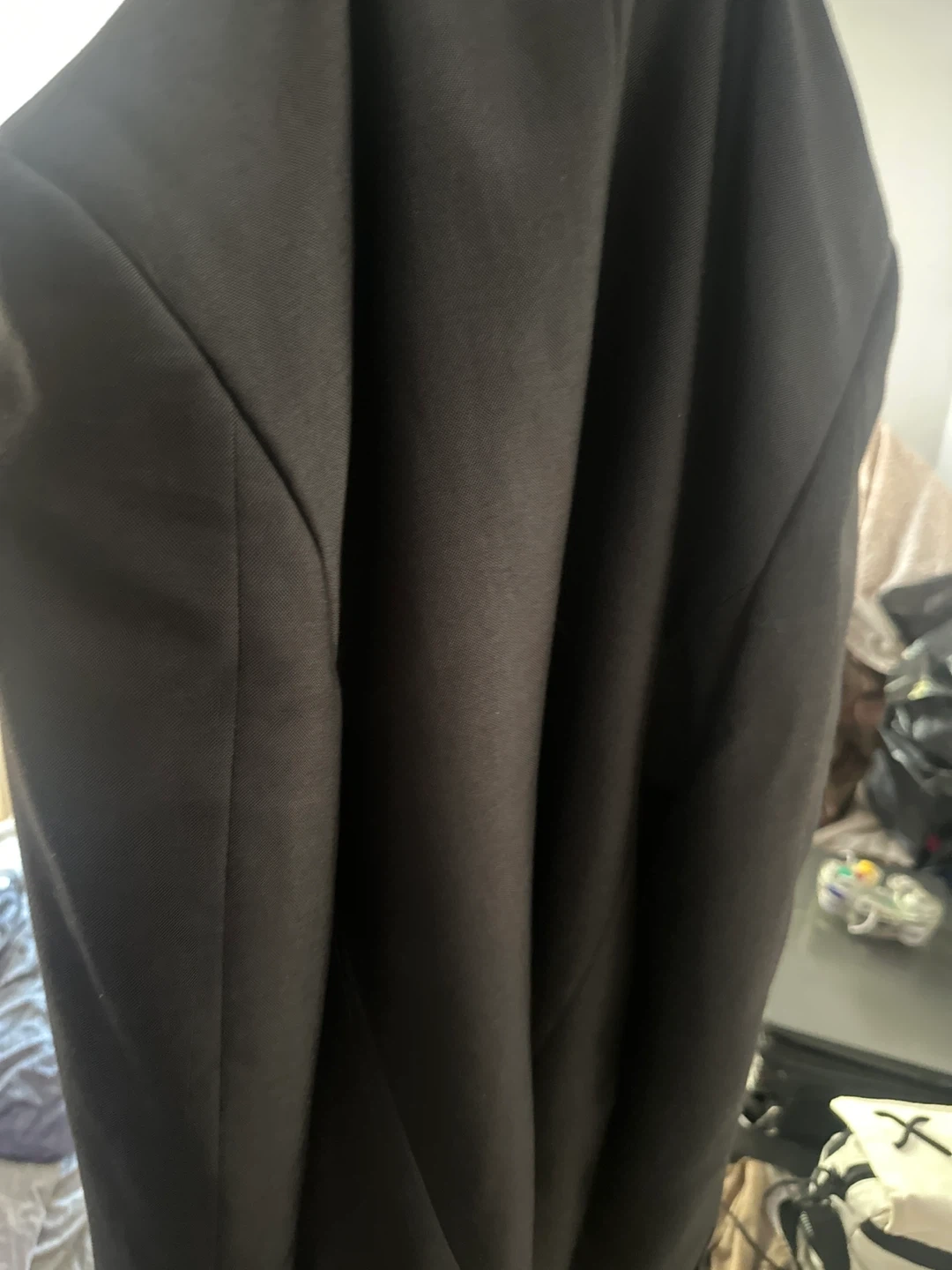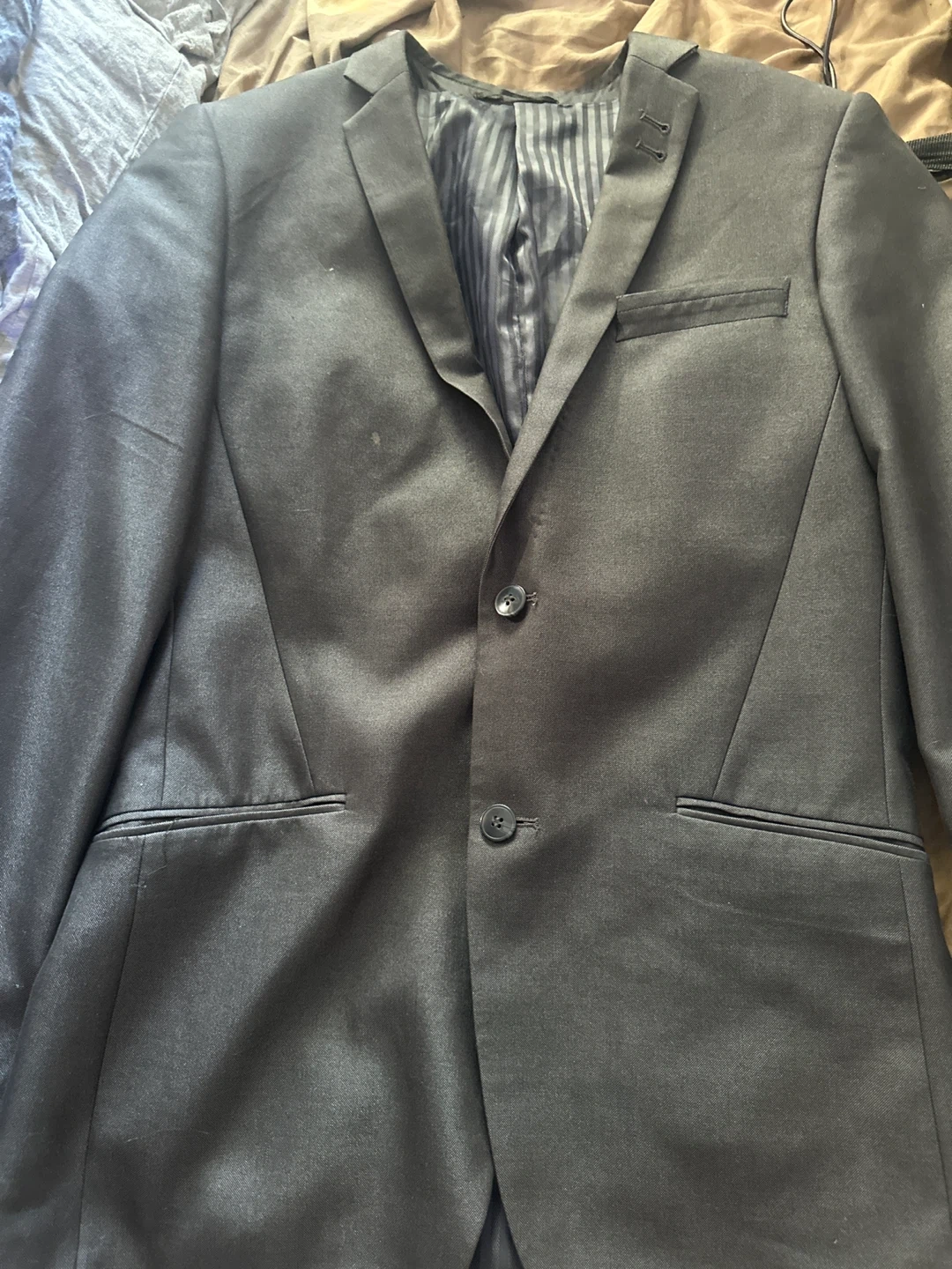 Selling a men's black blazer. It's in good condition and perfect for dressing up or down. A versatile addition to any wardrobe!