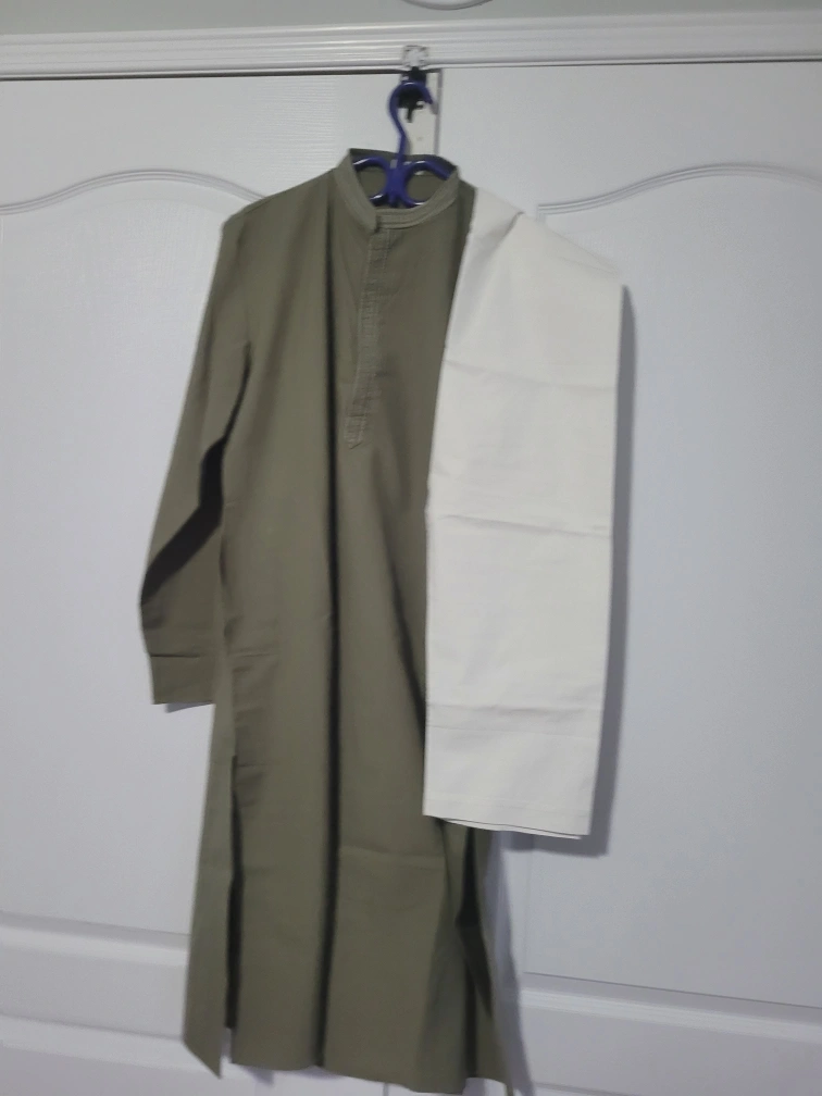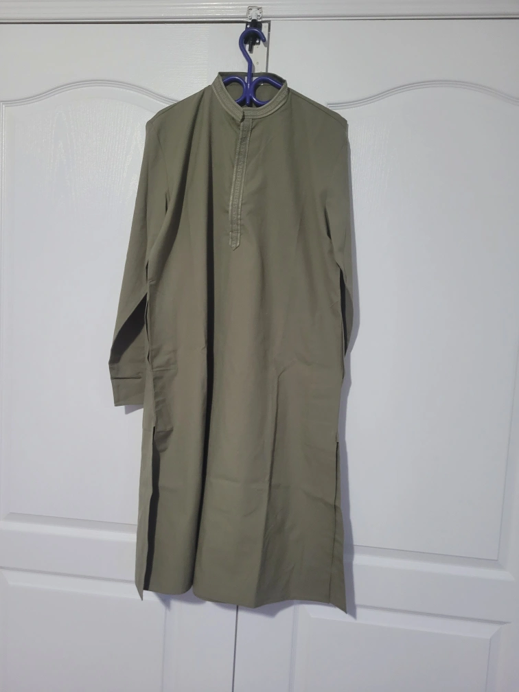 Selling a men's kurta pajama set in a nice olive green colour. It's in great condition and ready for a new home! Perfect for casual wear or special occasions. The fabric feels comfortable and breathable, ideal for all-day wear. It includes both the kurta (top) and pajama (bottom).