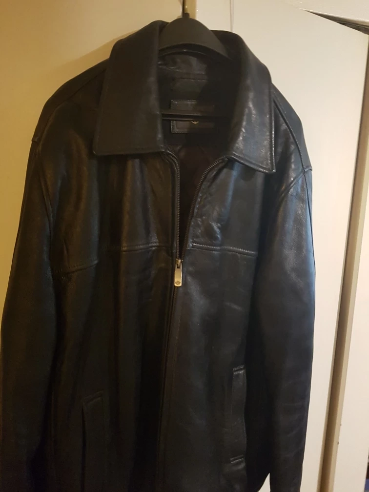 Black leather jacket. Zip up closure. Two front pockets.