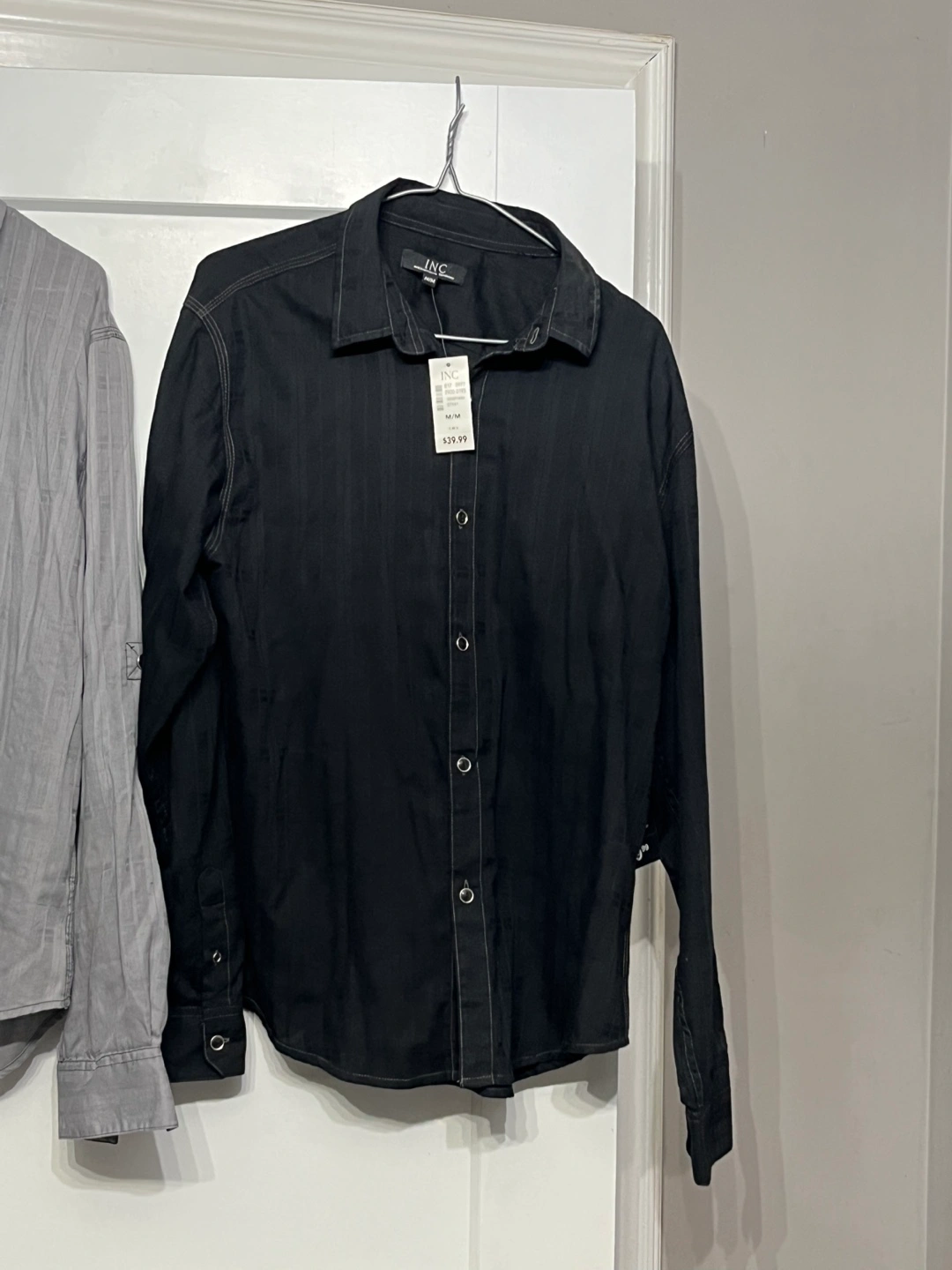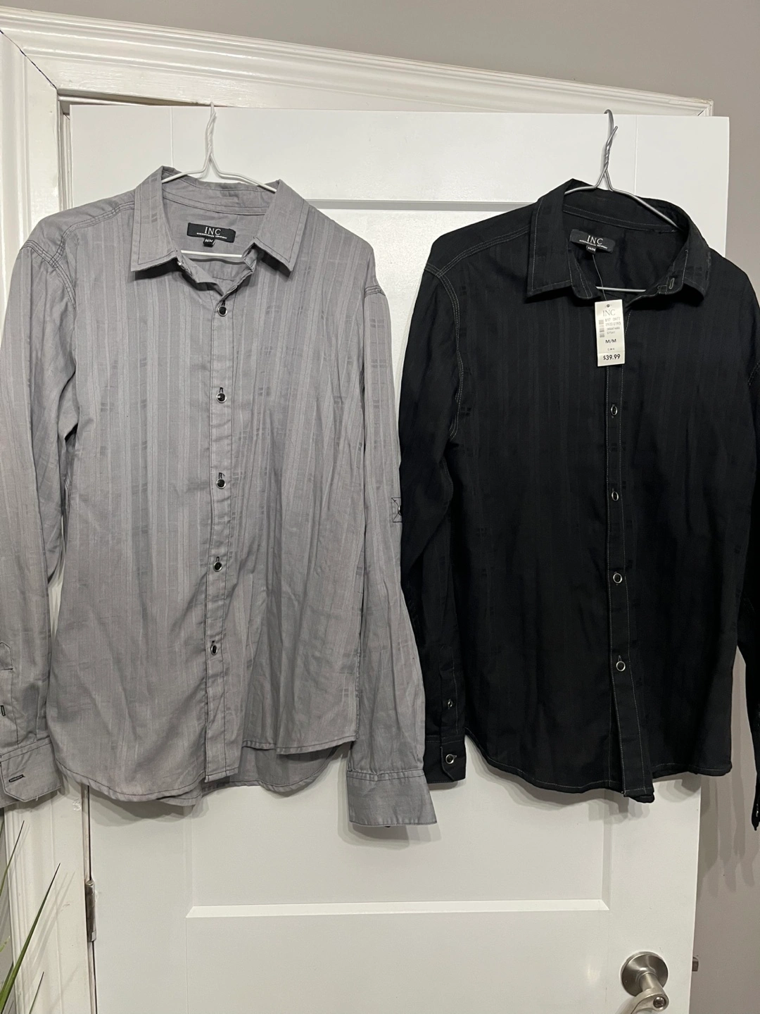 Two men's long sleeve shirts. One grey and one black. (Black never used )Both have a button-down collar. Both are size M/M. $15 for the pair. Pick up only. Closest intersection is Jane St and Eglinton Ave west.