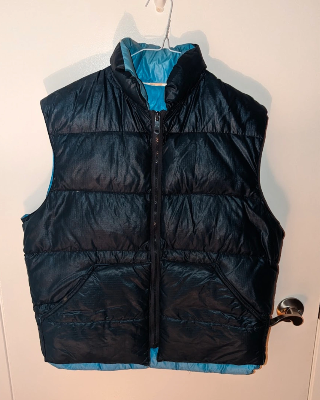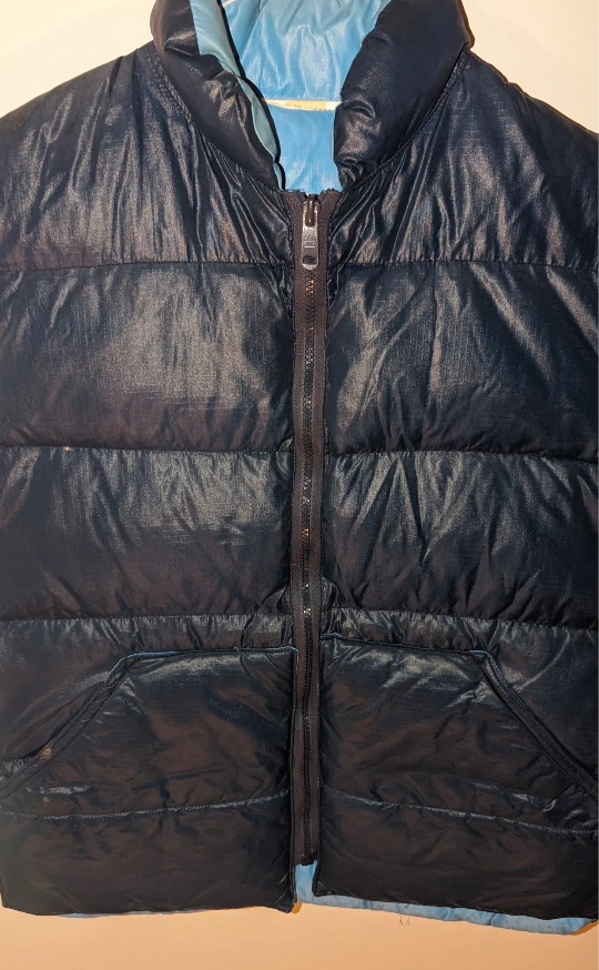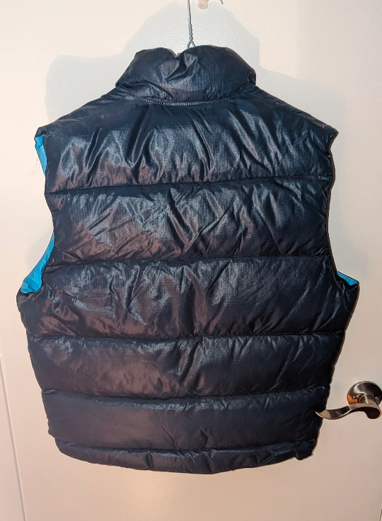 A cozy navy blue puffer vest, perfect for layering! It's in great shape and ready for a new home. The vest features a full zipper and a high collar to keep you warm on chilly days. It's a versatile piece that can be dressed up or down!