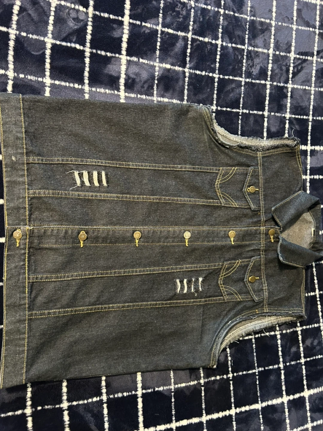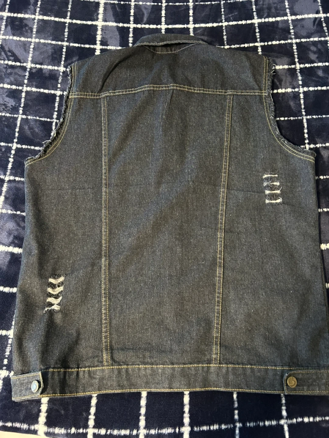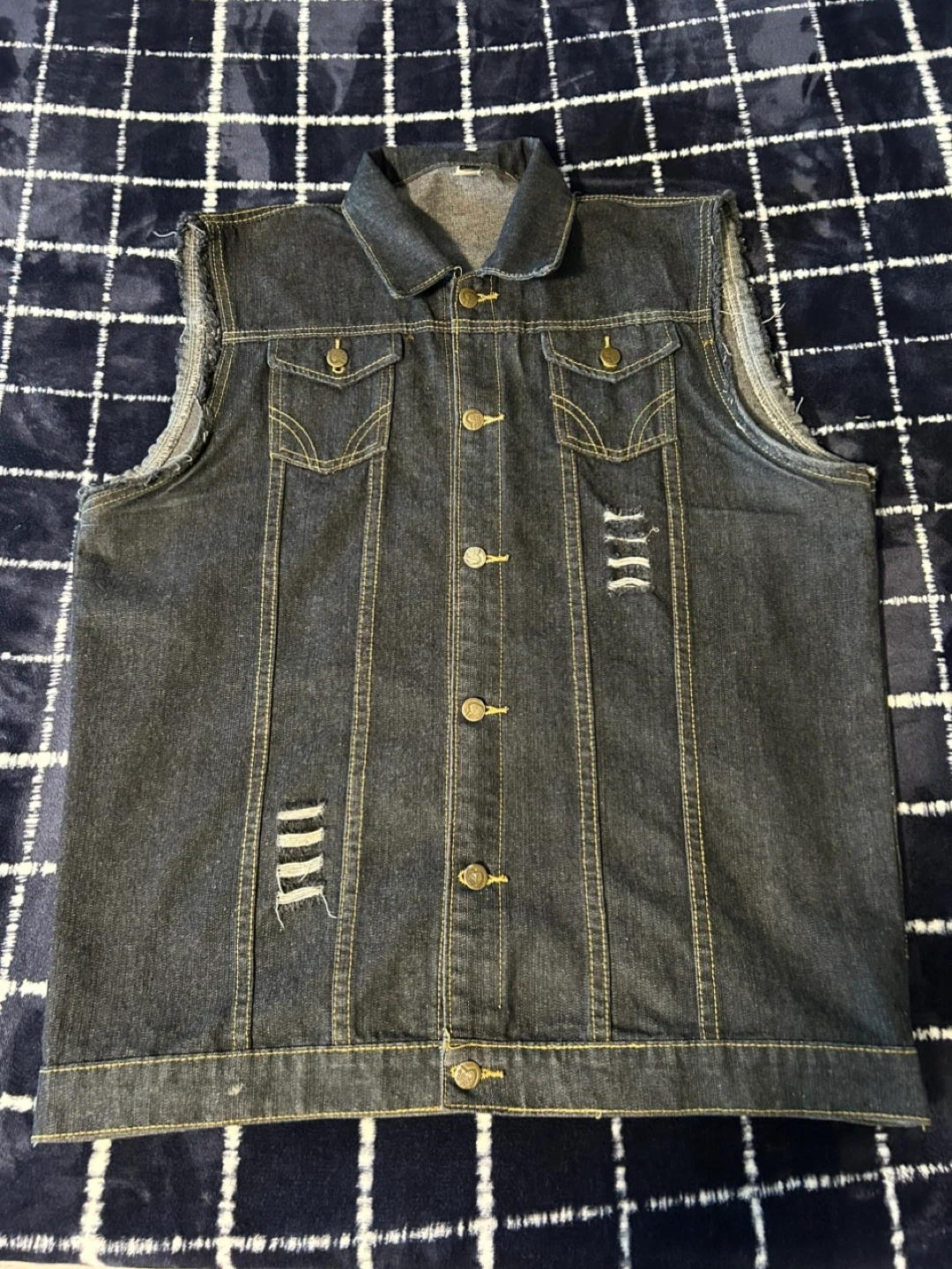 . It has a unique distressed look with some rips and tears. Perfect for layering or adding some edge to your outfit!