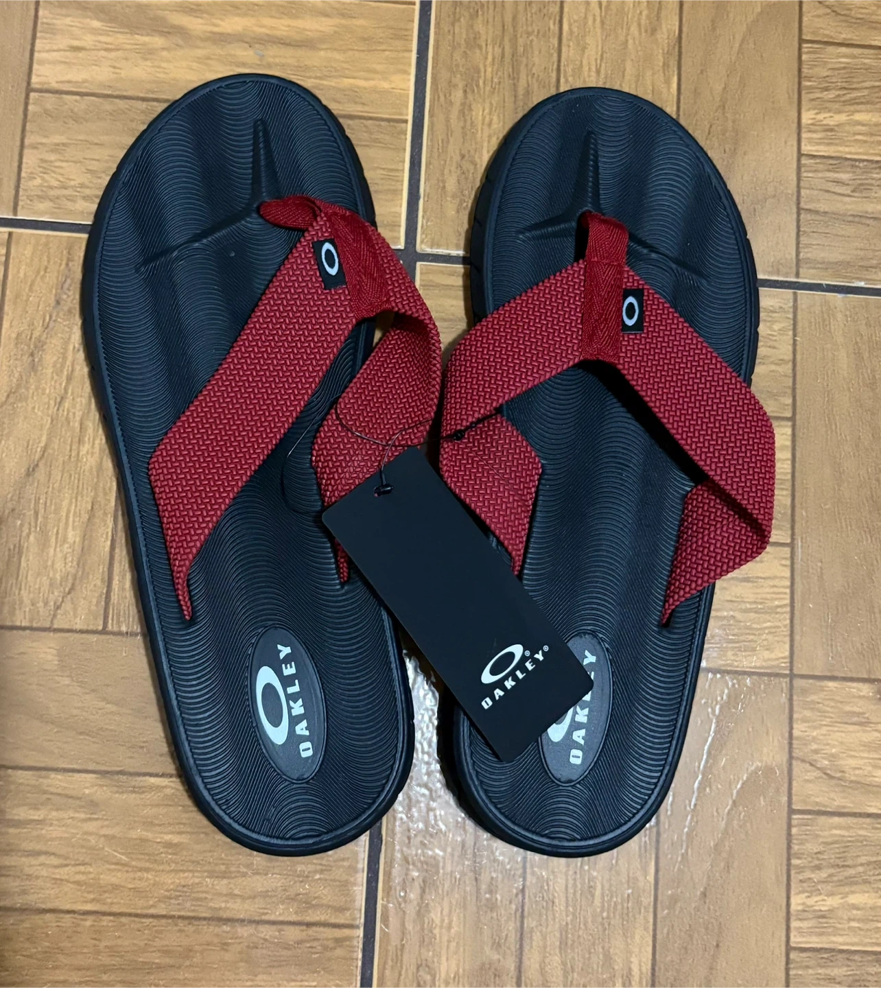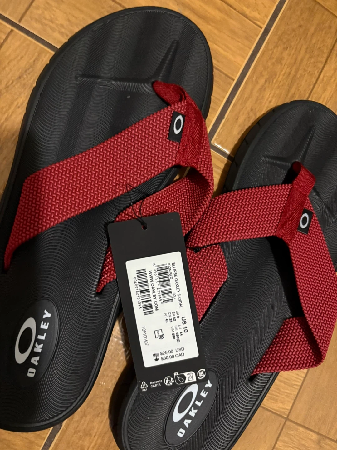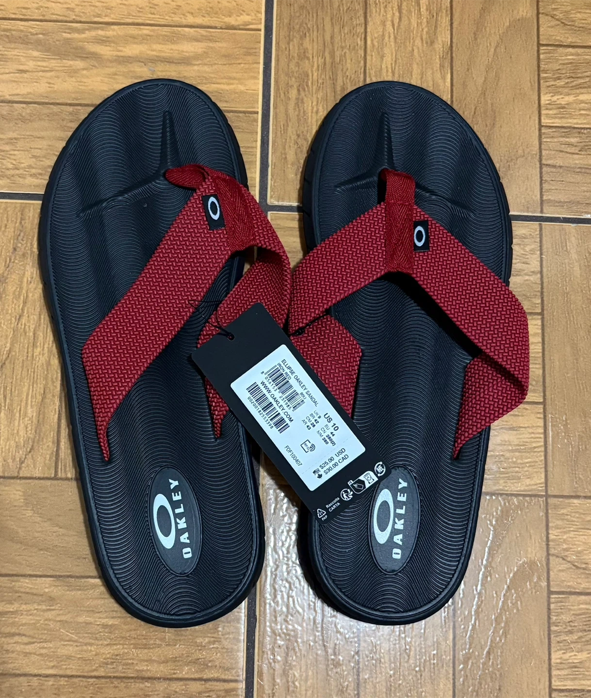 Selling a Brand new pair of Oakley Ellipse Flip Flop in US size 10! New with Tag. Authentic 😊 They feature a sleek black design with a red strap. Feature a textile and EVA upper with a TPR sole. Originally priced at $30.00 CAD Plus Tax 😊 These sandals are perfect for everyday wear