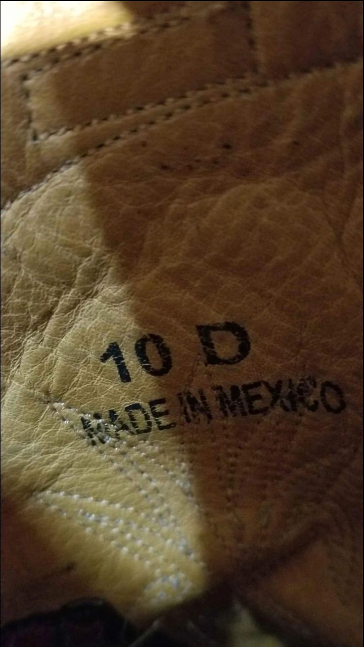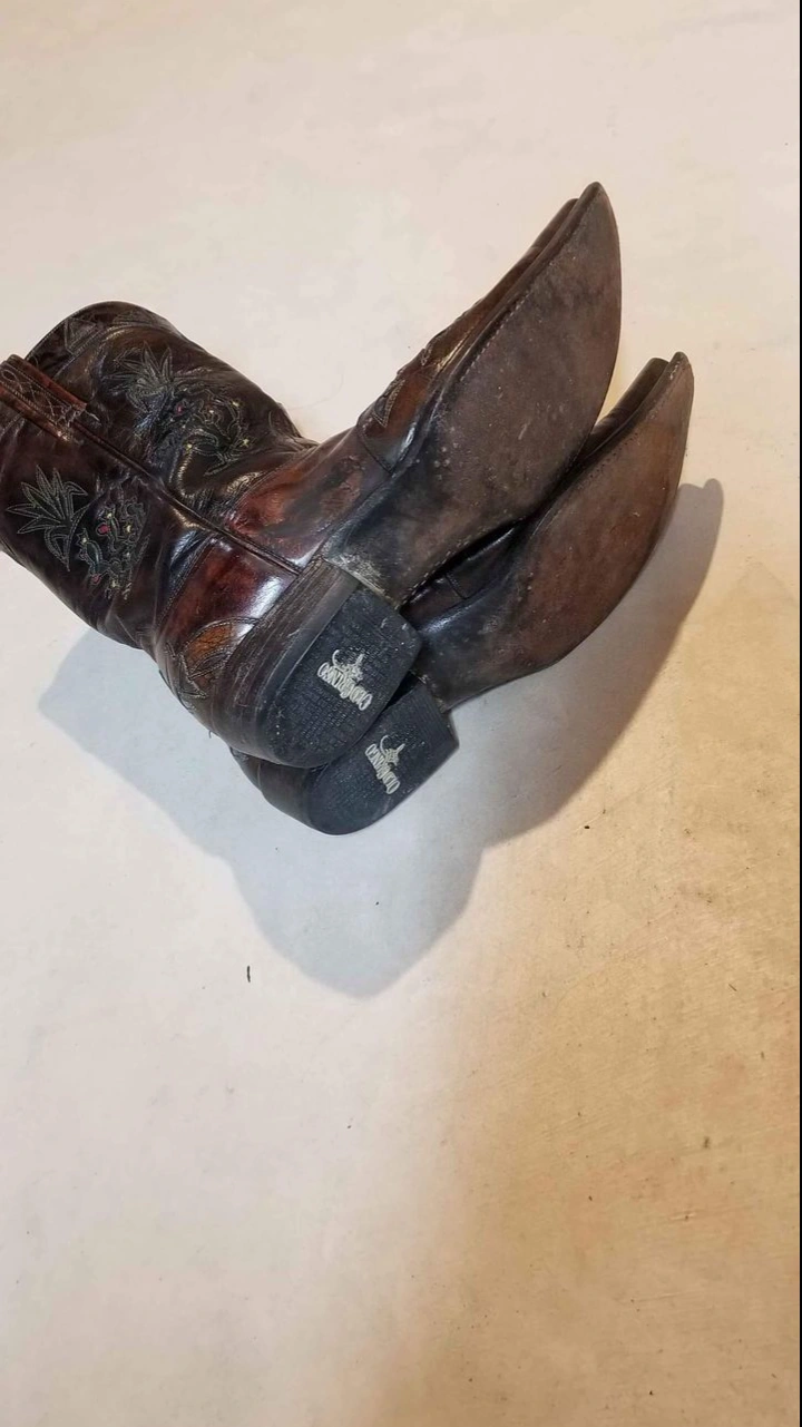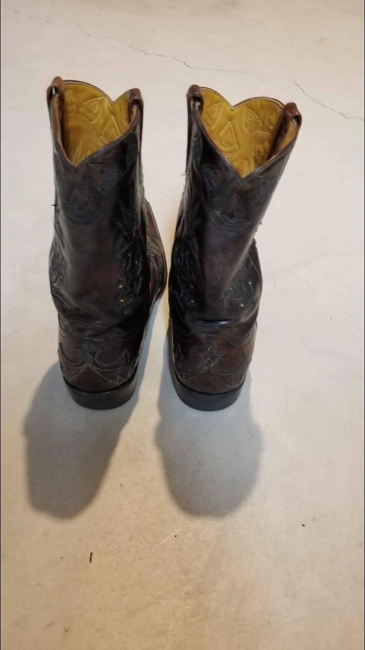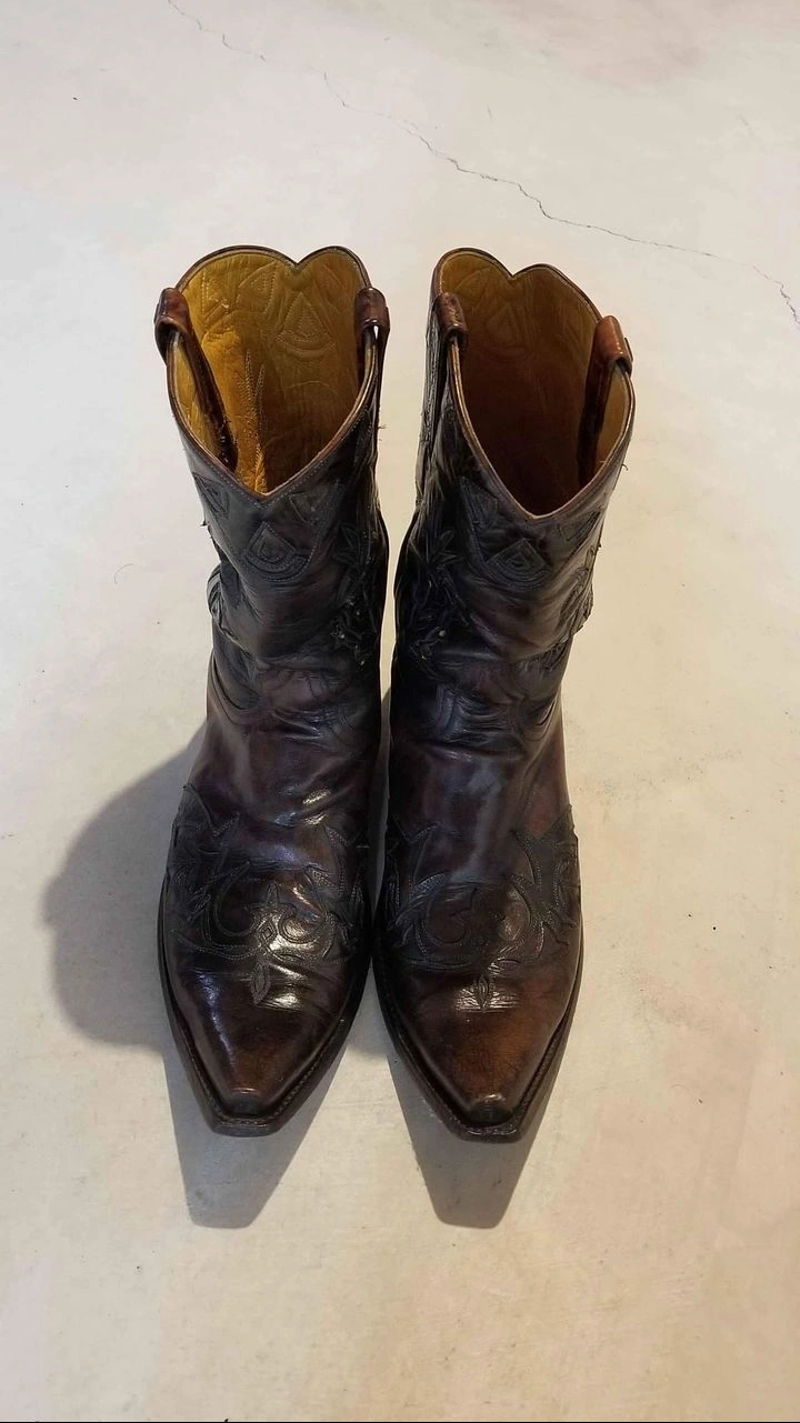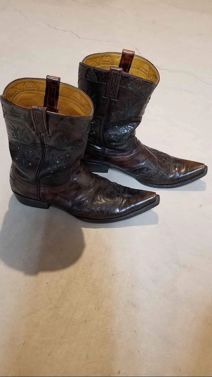 Pair of men's brown leather cowboy boots. Size 10D. Intricate floral tooling. Made in Mexico. Pointed toe.