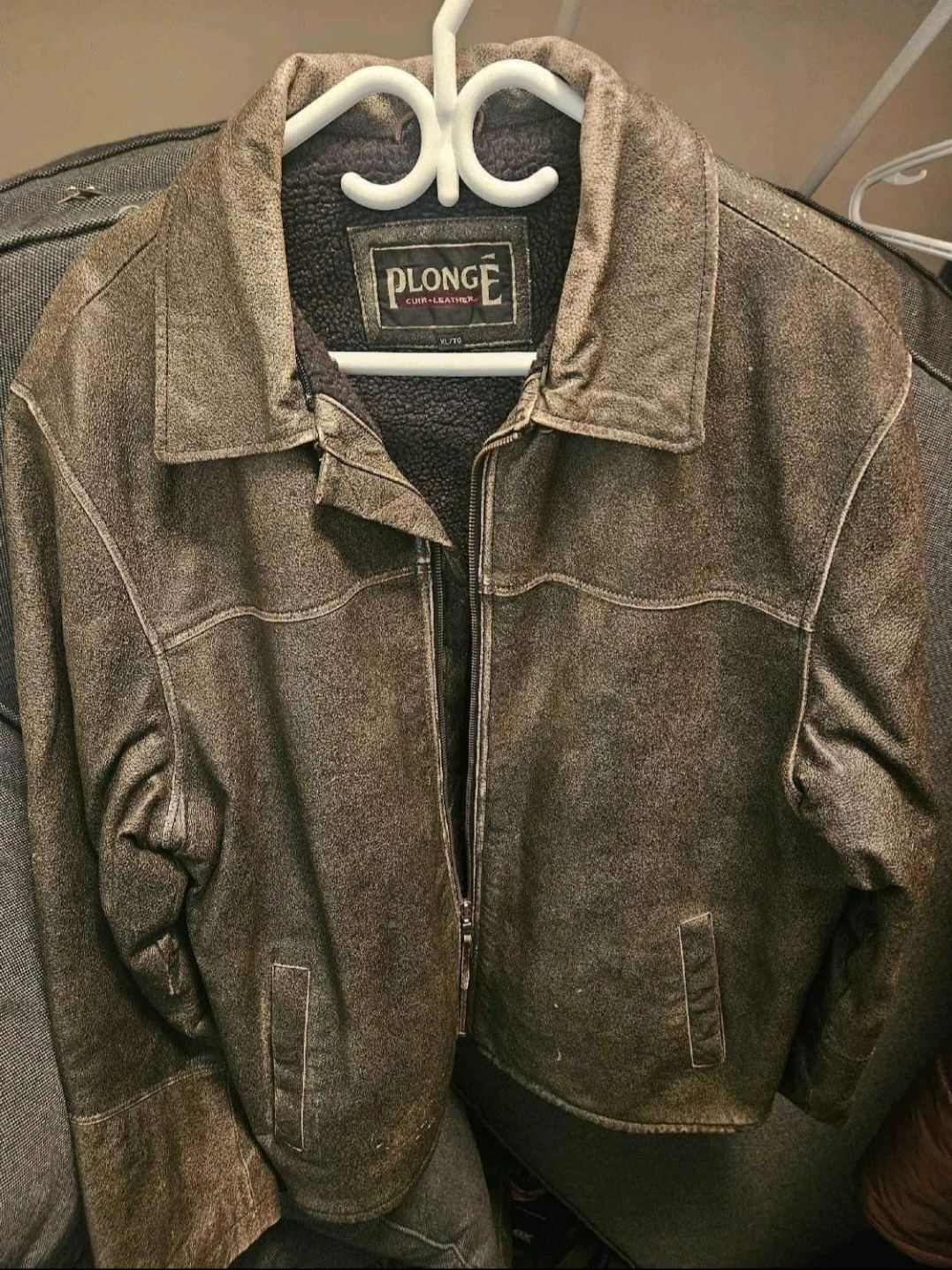 Plonge leather jacket. Size XL. Dark brown colour. Zip-up front. Fleece lining.