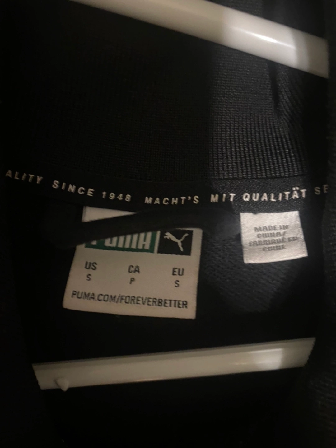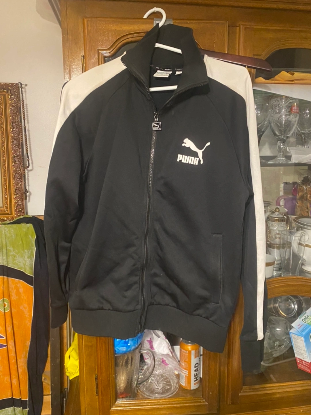 Black Puma track jacket. Features white side stripes and a zipper closure. Size small. Made in China. Good condition Cash only