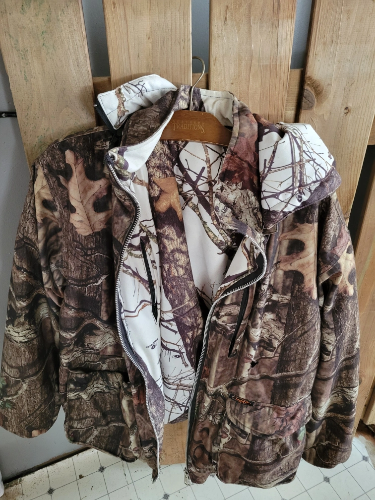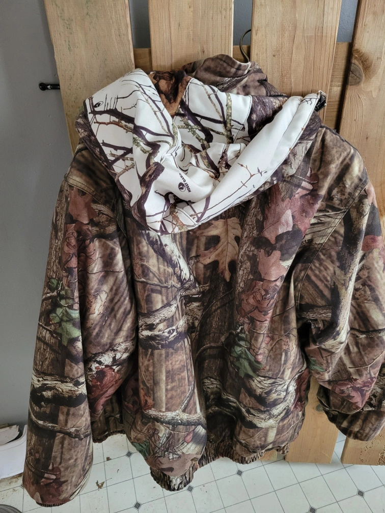 Realtree Xtra camouflage jacket. Full zip. Hooded. Multiple pockets. Great for hunting or outdoor activities.