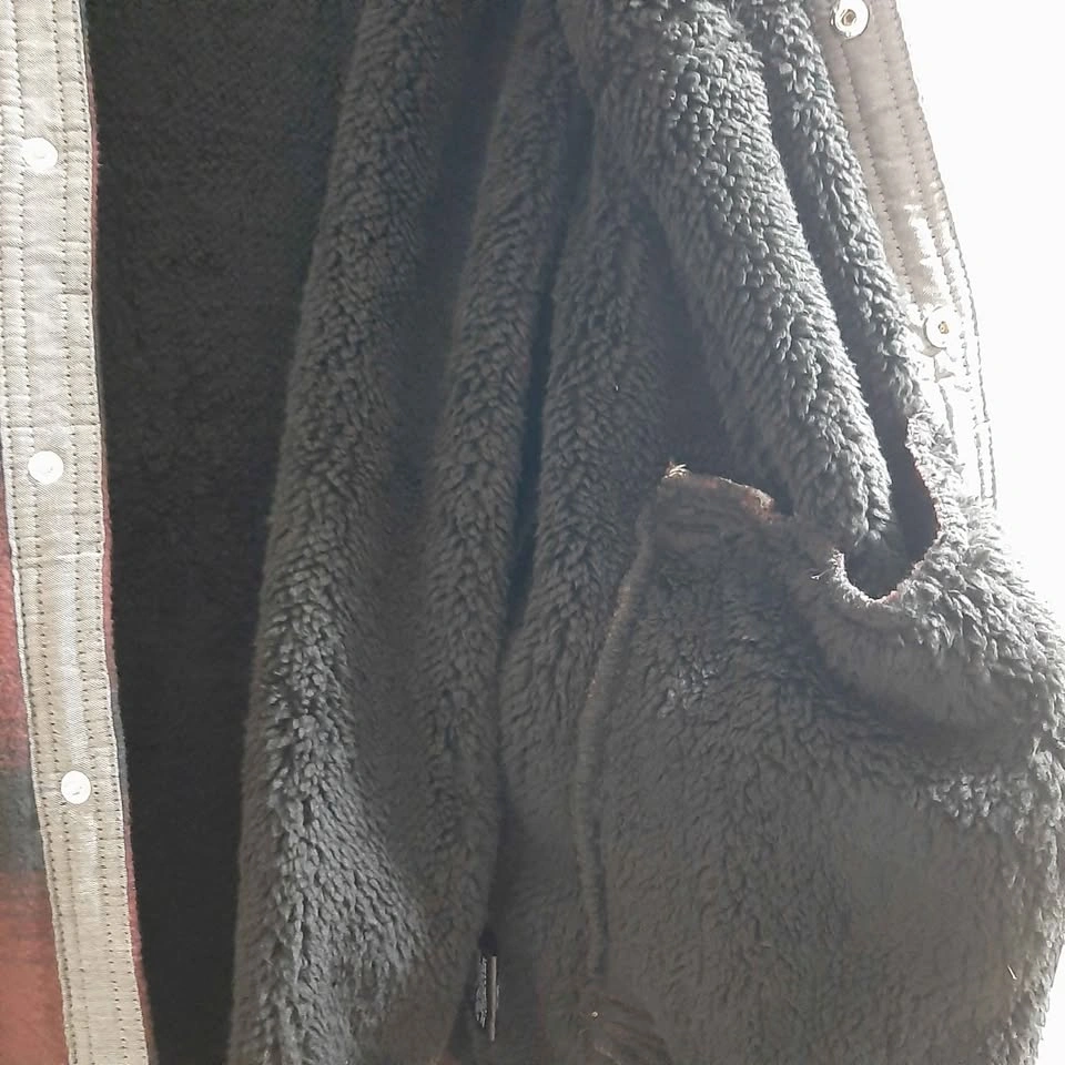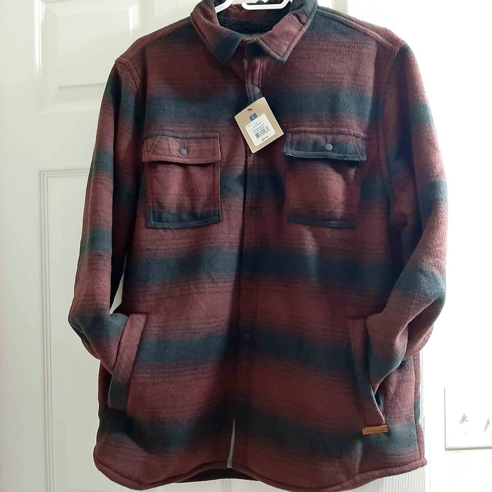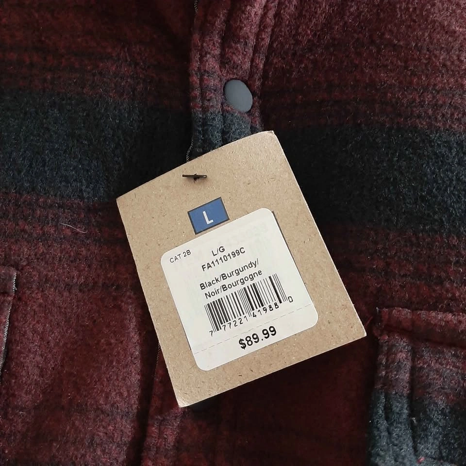 Men's Shacket with fleece lining and 2 inside pockets. Size large. Burgundy and black in color. New with tags. Asking 20.00. Pick up in Leduc. Pending Pick up