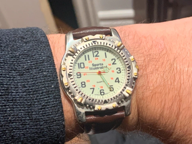 Here we have a men's Quartz watch with the Sports Illustrated logo on the dial. The Japan quartz movement is fully functional and comes with a new battery. My wrist is 7inch.