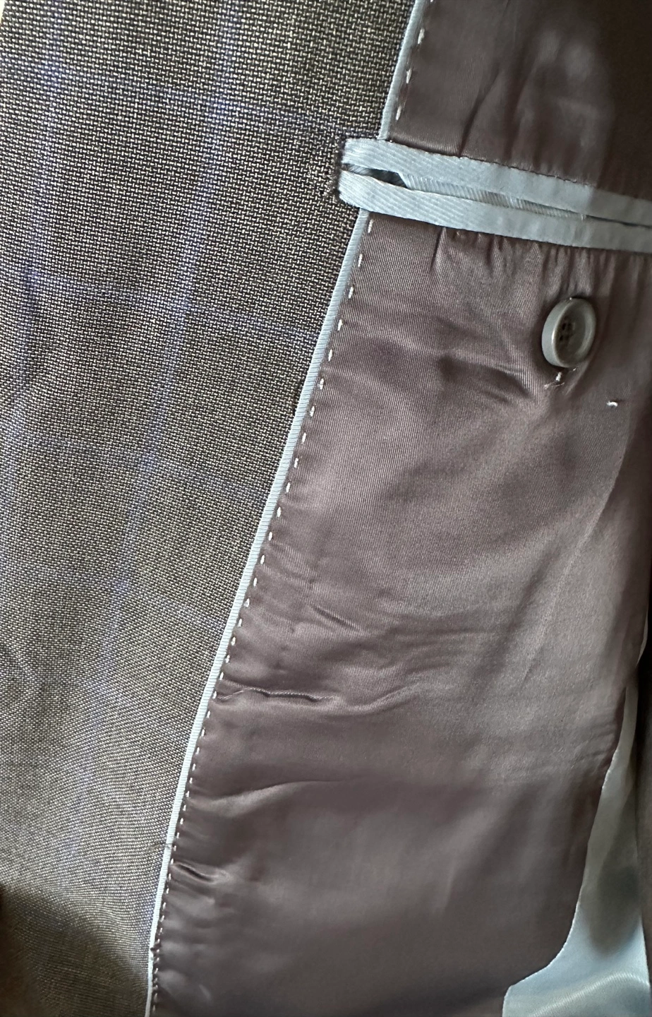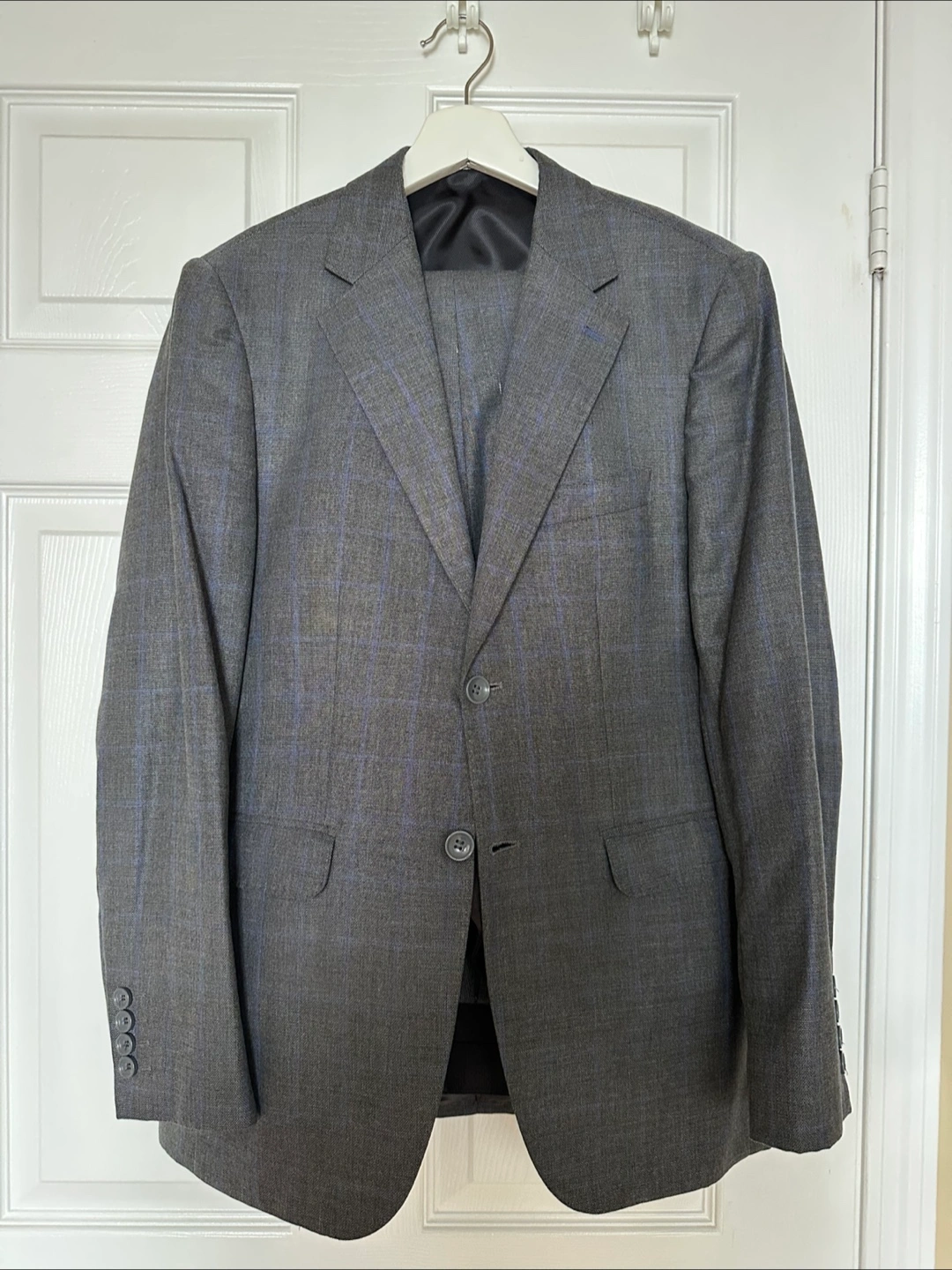 Grey men's suit. Absolutely clean and like new. Size 48, drop 6. Dry clean only. Subtle check gray and blue pattern. Two-button closure. Fits a person who weighs around 70-80kg and is 1.70cm tall. Pick up near Scarborough Town Centre.
