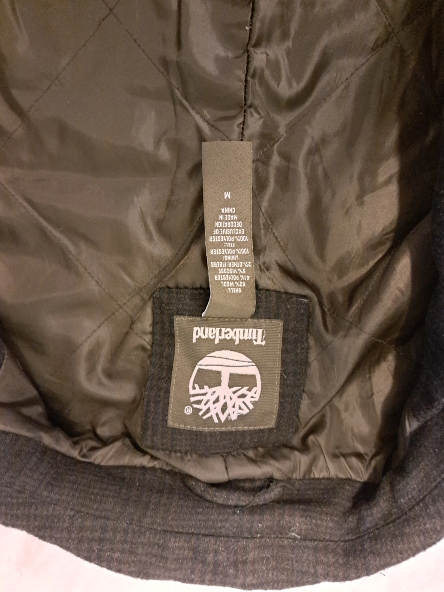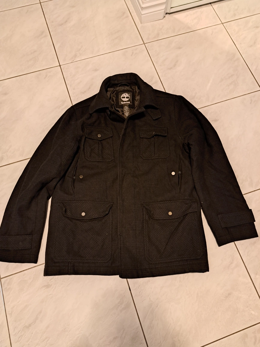 Men's black coat with fine plaid pattern. Size medium. Multiple pockets. Lined. Good condition.